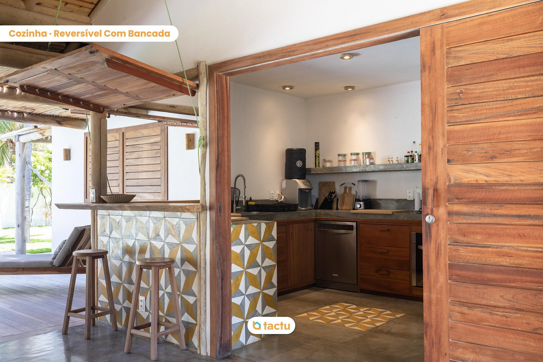 Dès l’entrée, vous serez accueilli par un salon spacieux et aéré, avec un plafond haut, des canapés confortables, une Smart TV et une intégration totale avec la terrasse et l’extérieur. La cuisine américaine attenante est entièrement équipée : réfrigérateur double, cuisinière, micro-ondes, four électrique, cafetière, filtre à eau et tous les ustensiles nécessaires pour votre séjour.