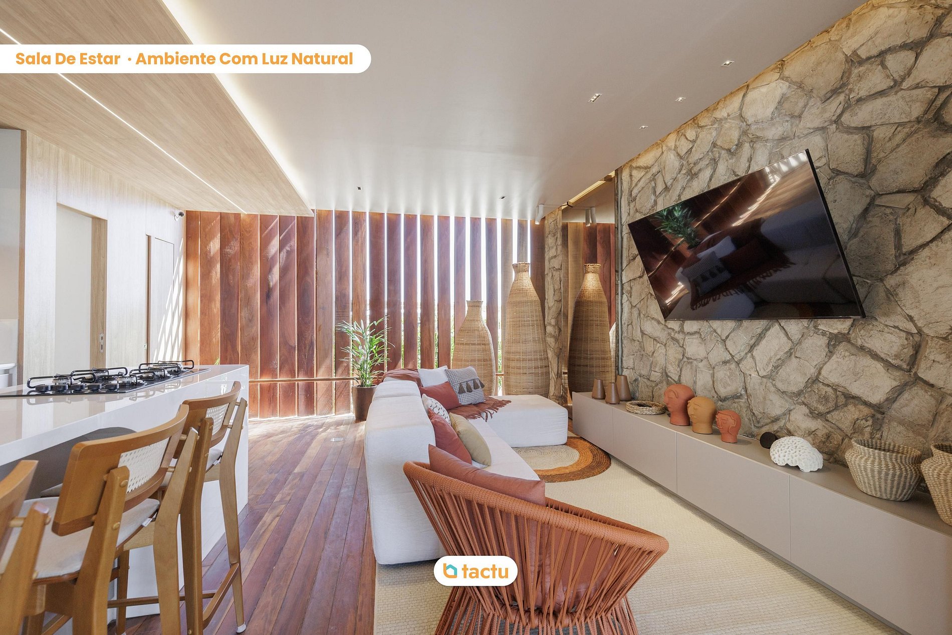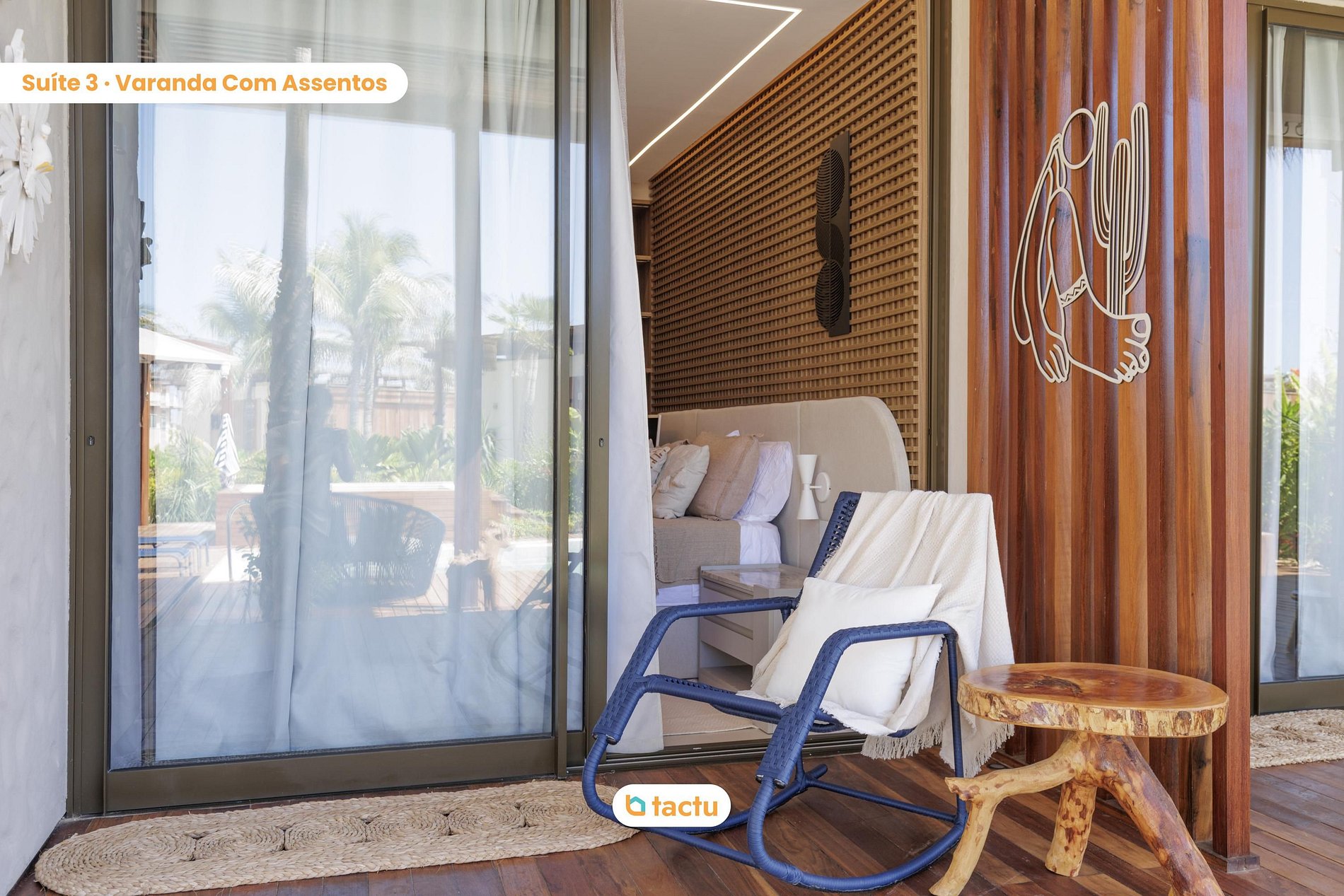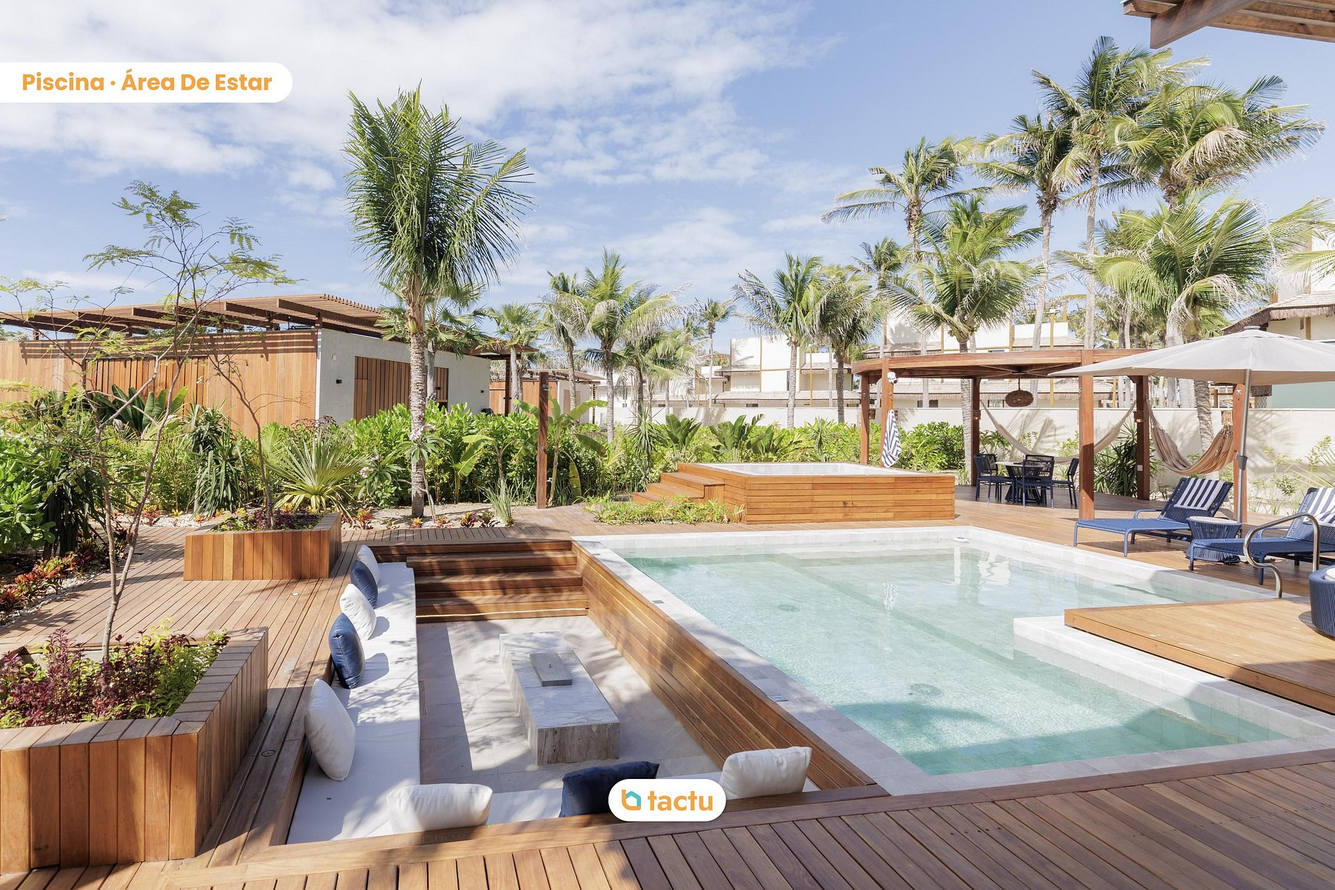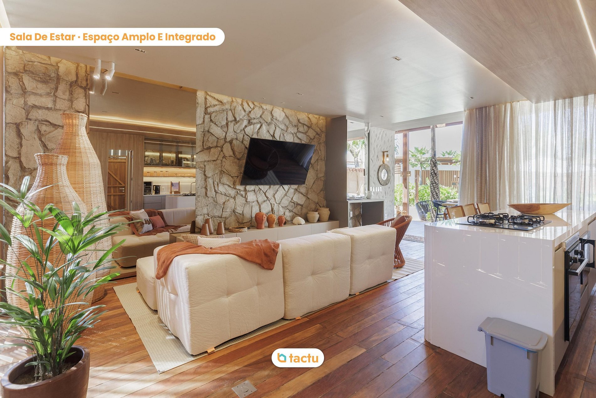 Le salon, intégré à la cuisine, dispose de murs en lattes de bois, permettant une ventilation naturelle et une lumière optimale, créant une atmosphère fraîche et accueillante. Avec sécurité 24h/24 et un accès facile à la plage, vous vivrez le meilleur de Fortim avec tout le confort et l’exclusivité que Tactu offre.