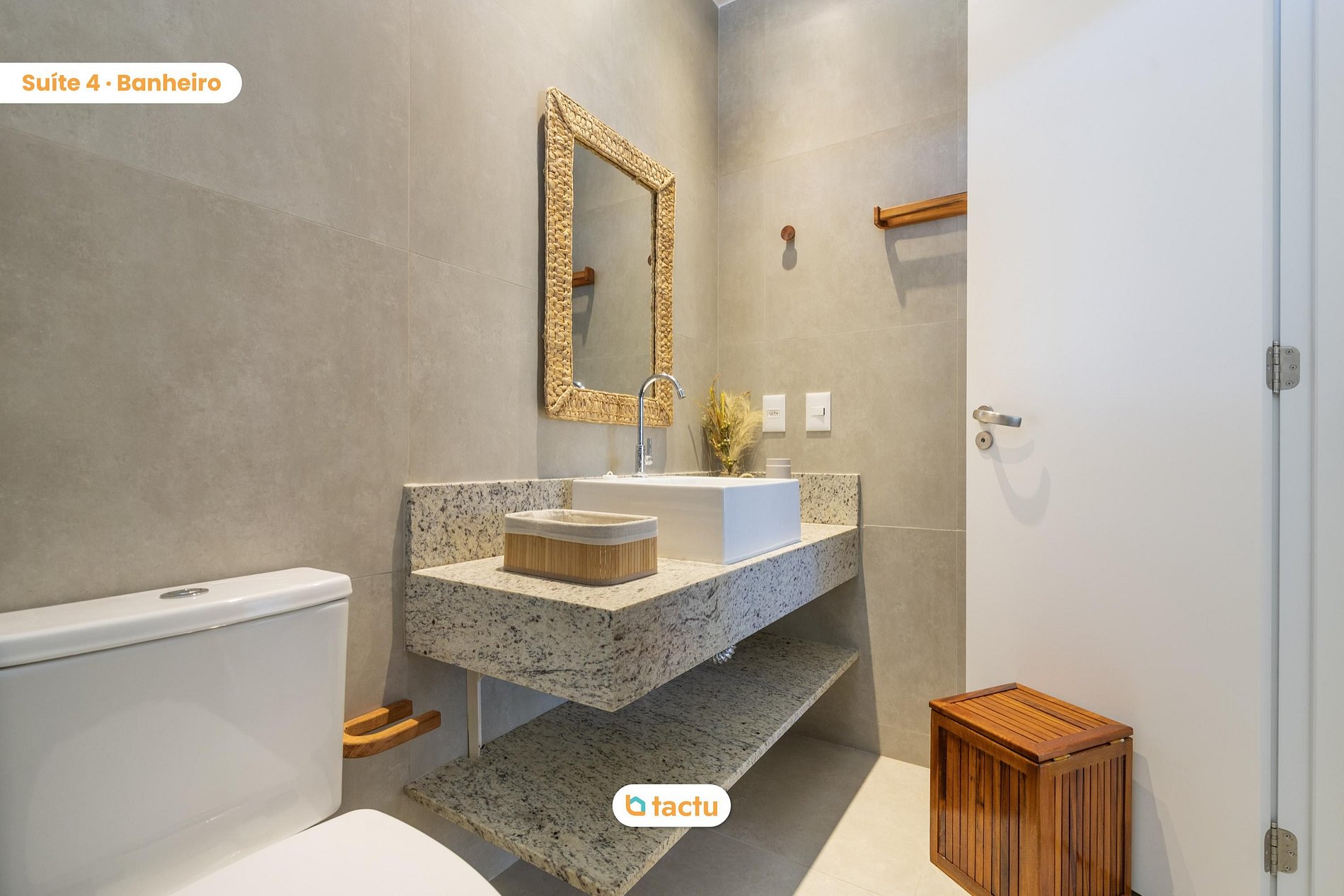 Au rez-de-chaussée, l’espace extérieur invite à la convivialité et au loisir : piscine privée, table à manger en plein air pour huit personnes, chaises longues, un salon avec canapé et hamac, ainsi qu’une terrasse équipée d’un îlot de service, d’un évier, de placards et d’un barbecue électrique. C’est le cadre idéal pour des moments détendus en famille ou entre amis. À l’intérieur, vous trouverez un grand salon climatisé avec air conditionné central et une télévision de 75 pouces. Il communique avec une salle à manger dotée d’une table ronde pour huit personnes et d’un îlot avec quatre sièges supplémentaires donnant sur la cuisine. Cet espace comprend également un vaisselier, une cave à vin et une tireuse à bière, créant une ambiance élégante et fonctionnelle. La cuisine est entièrement équipée : plaque à induction, four encastré, micro-ondes, réfrigérateur frost free, grands placards, ainsi qu’une buanderie avec évier, étendoir, lave-linge et lave-vaisselle. Sur ce même niveau se trouvent également des toilettes et une suite avec deux lits simples et lits gigognes, air conditionné et meuble de rangement.
