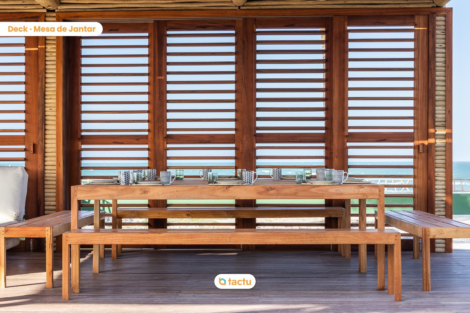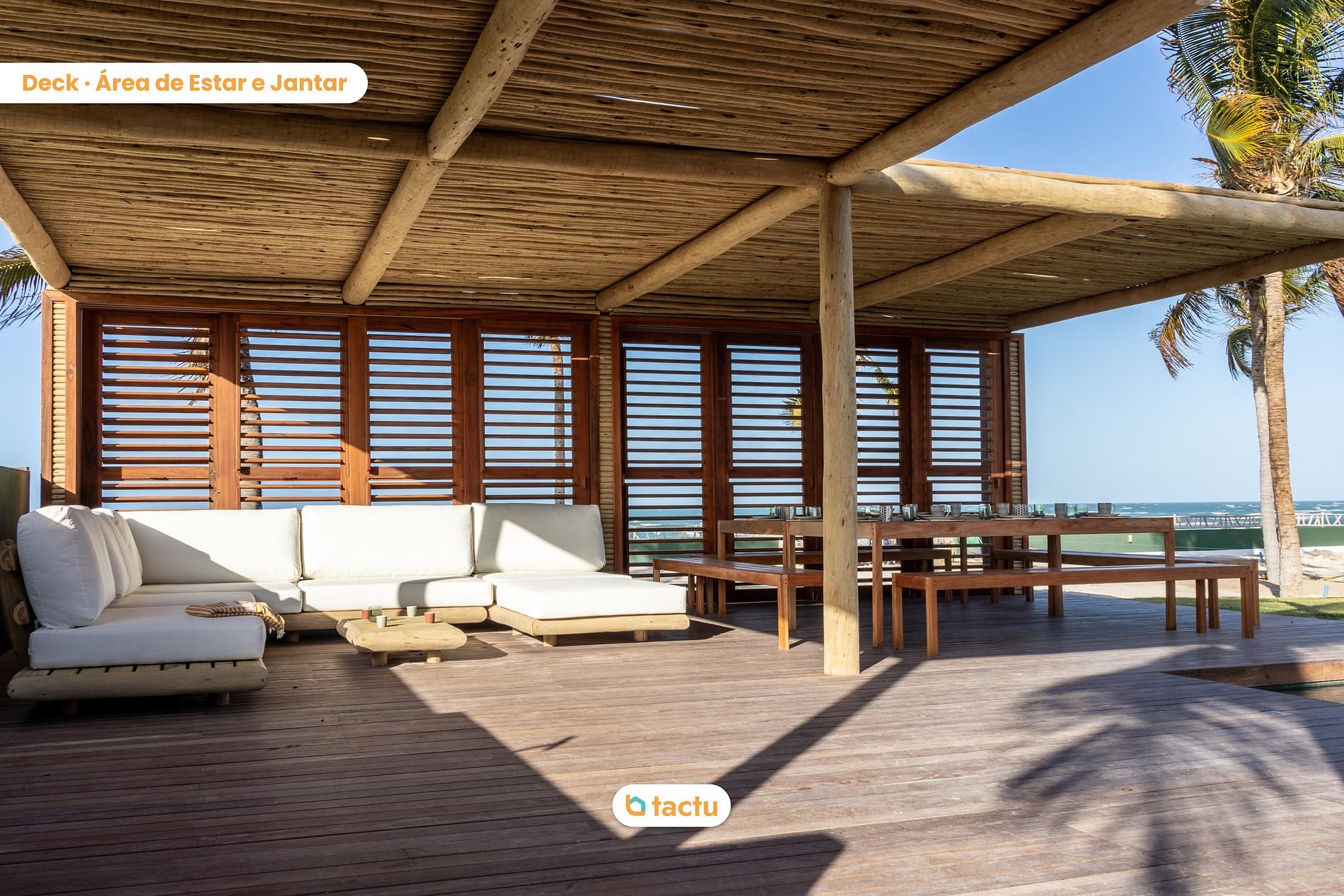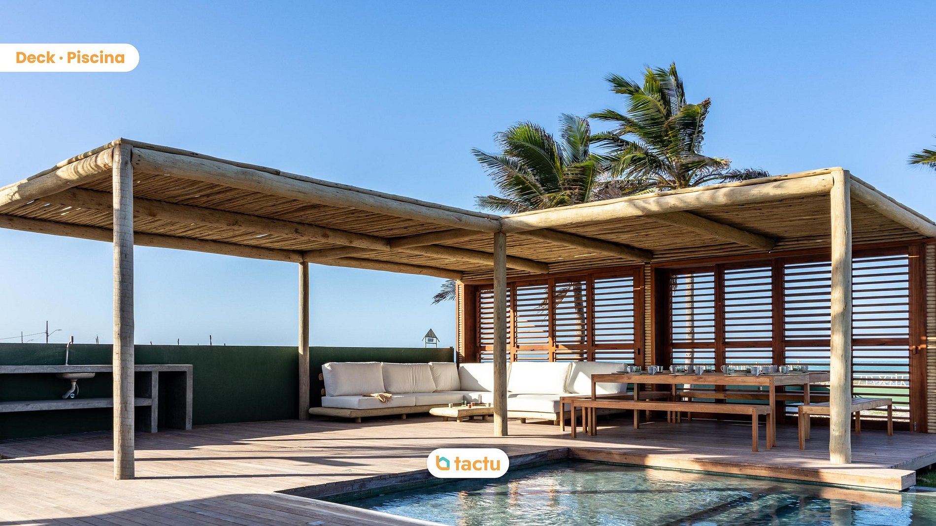 L’espace extérieur est un véritable havre. Un grand deck avec piscine s’étend en bord de mer, avec barbecue au charbon, bar privé, grande table à manger en bois massif et salon ombragé sous pergola avec coussins imperméables. L’endroit idéal pour profiter du soleil ou partager un apéritif au coucher du soleil.