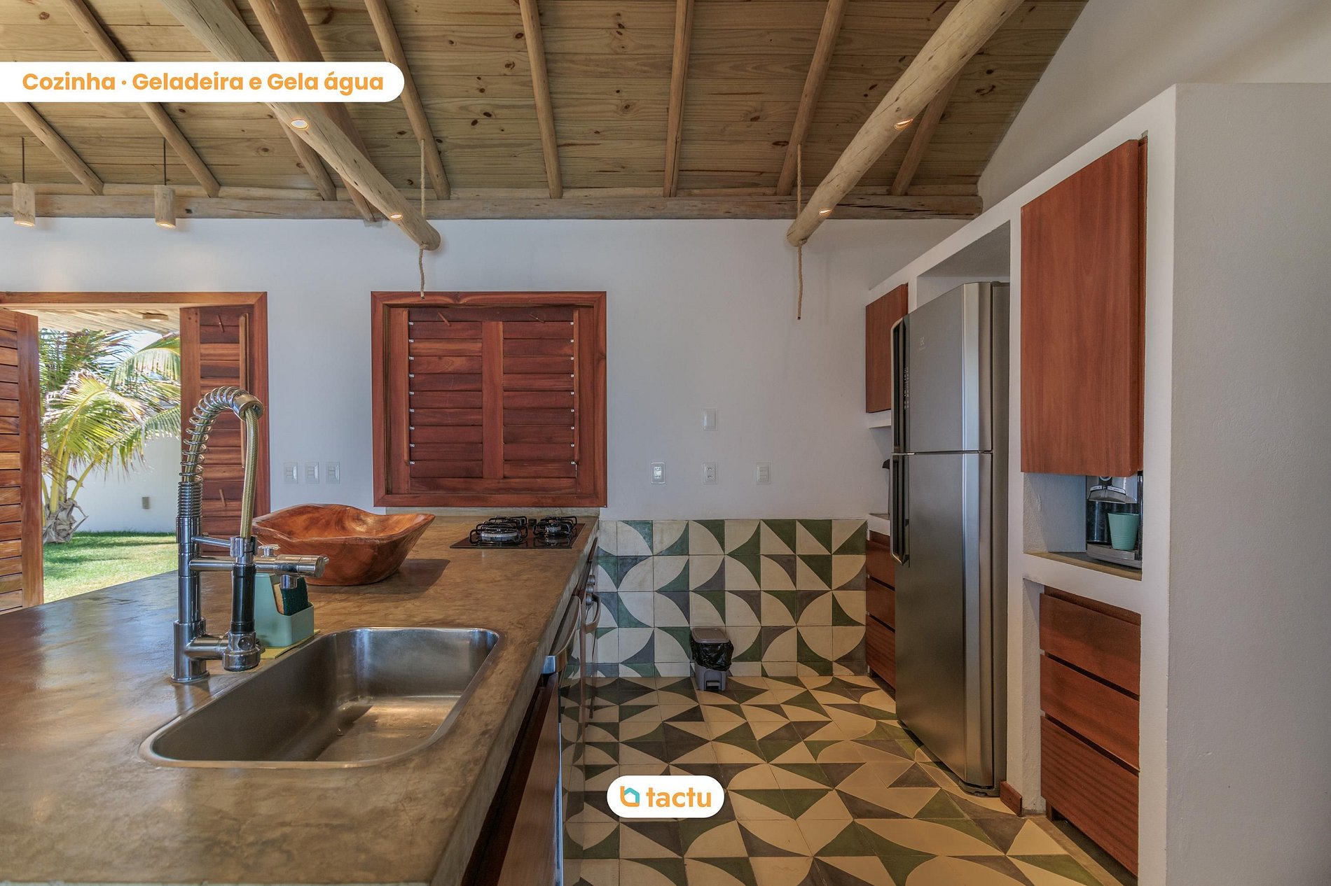 A cozinha é completa, equipada com geladeira, forno, fogão, micro-ondas, bebedouro e todos os utensílios necessários para uma estadia perfeita. A sala de estar é integrada à sala de jantar, ambas com vista deslumbrante para o jardim e o mar, oferecendo um excelente conforto térmico devido à boa ventilação.