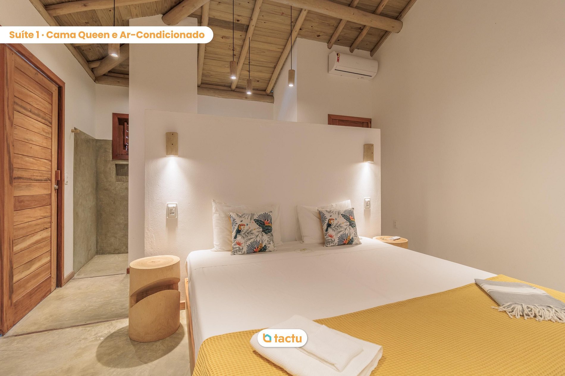 A Vila Oásis conta com quatro suítes climatizadas, recentemente pintadas e decoradas, além de dois quartos adicionais que compartilham um banheiro comum. As roupas de cama, de alta qualidade, são importadas da França. As camas têm colchões especiais que proporcionarão ótimas noites de sono. Todas as suítes possuem camas queen, e os quartos adicionais são ideais para acomodar grupos ou famílias.