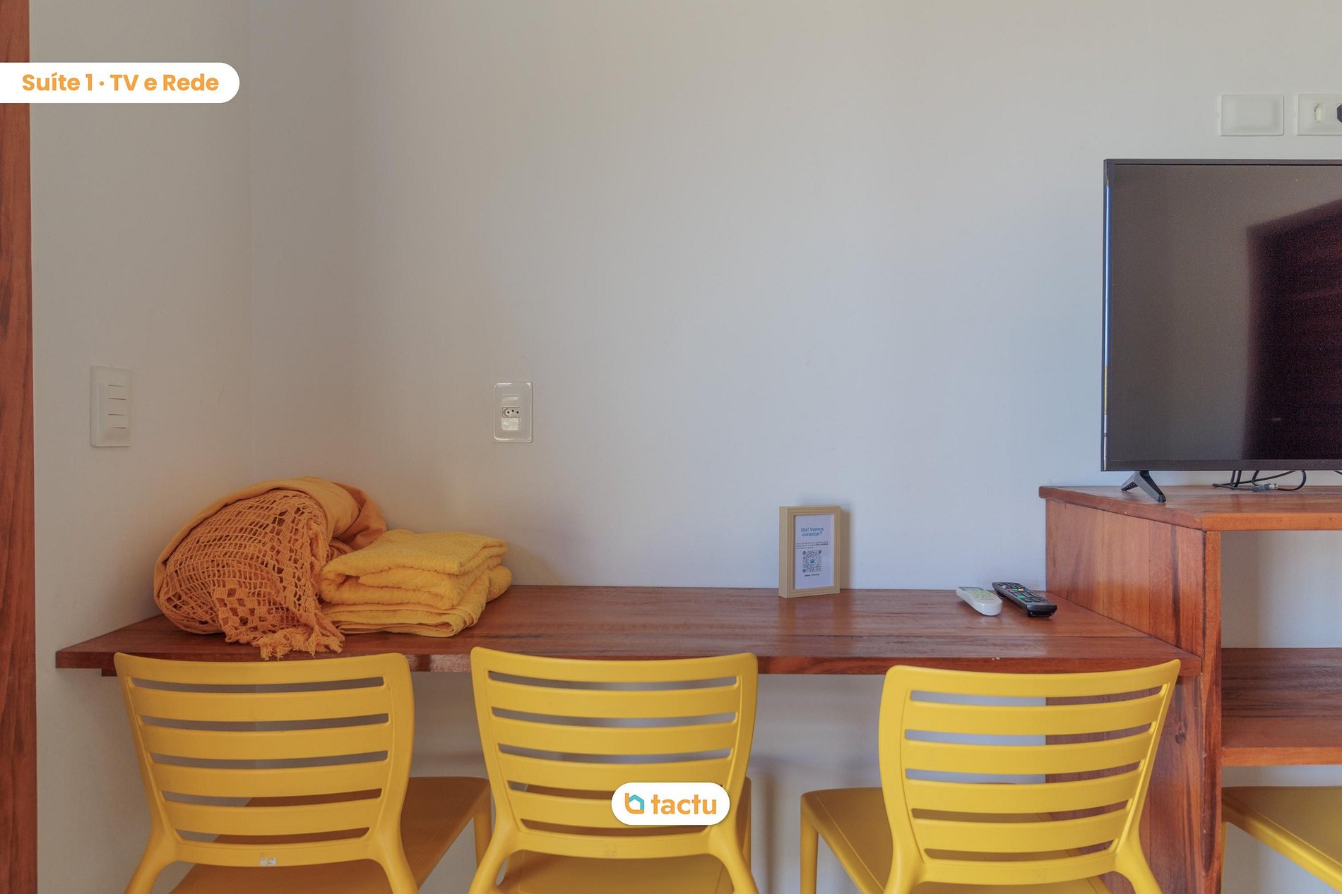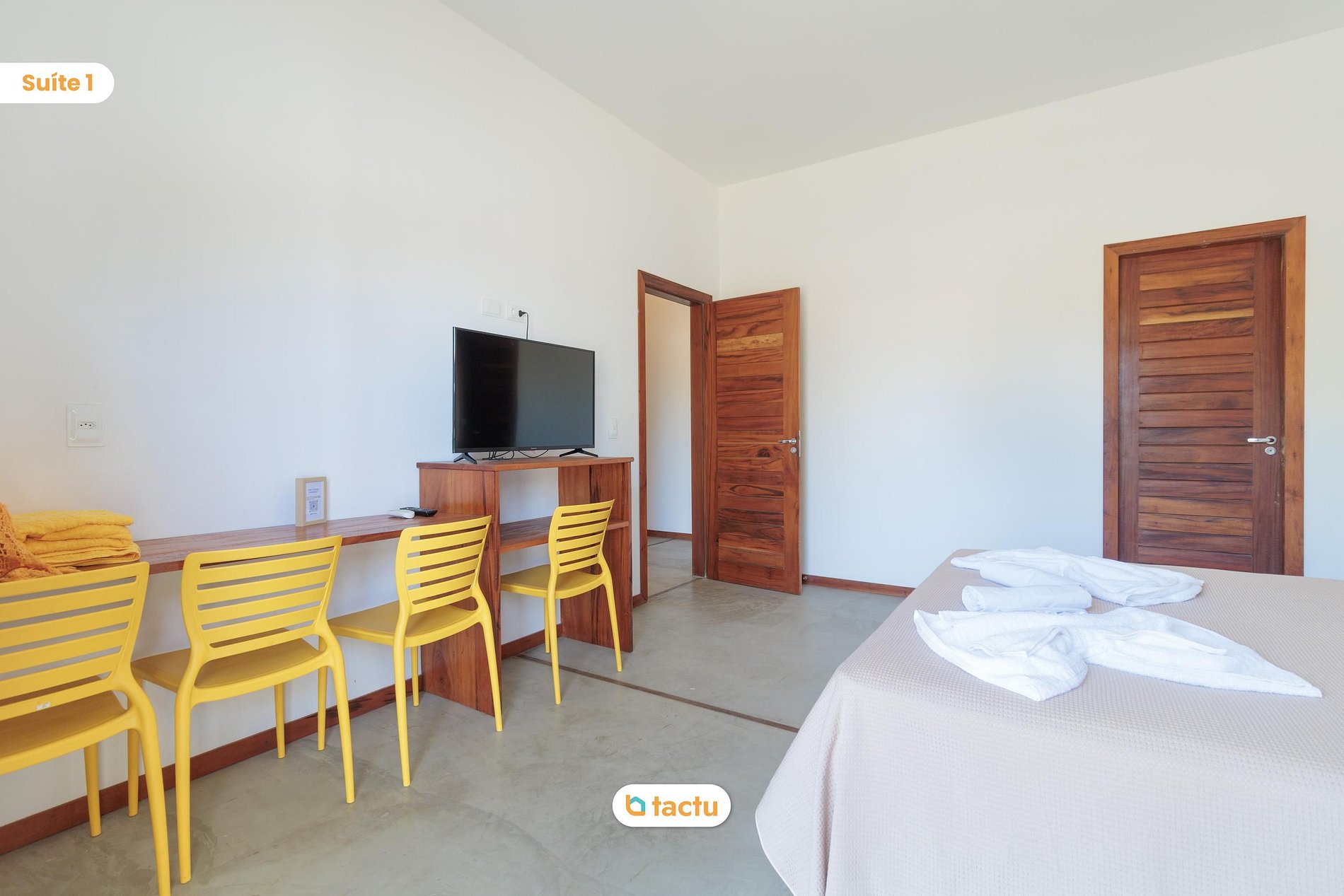 Ela possui 2 suítes, ambas climatizadas e renovadas, com pintura nova e decorações recentes! A suíte master conta com um colchão especial de casal e uma TV, enquanto que a outra suíte conta com duas camas de solteiro. Em ambos os banheiros, existem chuveiros elétricos que permitem um banho quentinho após um mergulho no mar ou na piscina.