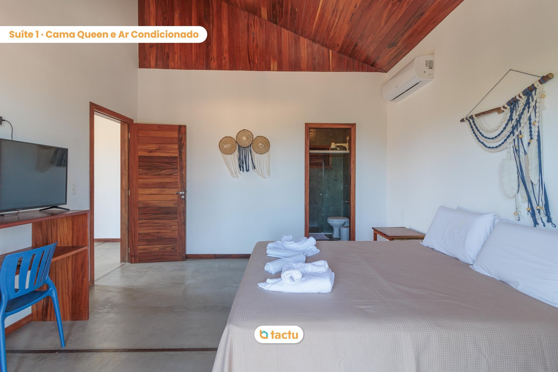 Ela possui 2 suítes, ambas climatizadas e renovadas, com pintura nova e decorações recentes! A suíte master conta com um colchão especial queen e uma TV enorme, onde a outra conta com duas camas de solteiro. Em ambos banheiros existem chuveiros elétricos que permitem um banho quentinho após um mergulho no mar ou na piscina.