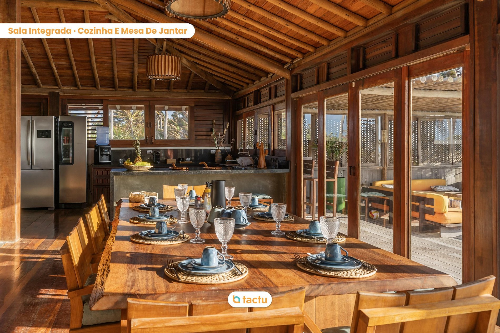 Na área social, os hóspedes encontram uma sala ampla e integrada, com estar e cozinha completamente equipada, ideal para reunir todos em torno da mesa. O ambiente mantém o charme rústico sofisticado, com estrutura em madeira, pé-direito alto e iluminação acolhedora. A cozinha conta com equipamentos modernos, duas geladeiras, cafeteiras, forno, cooktop e todos os utensílios necessários para preparar refeições com praticidade e estilo.