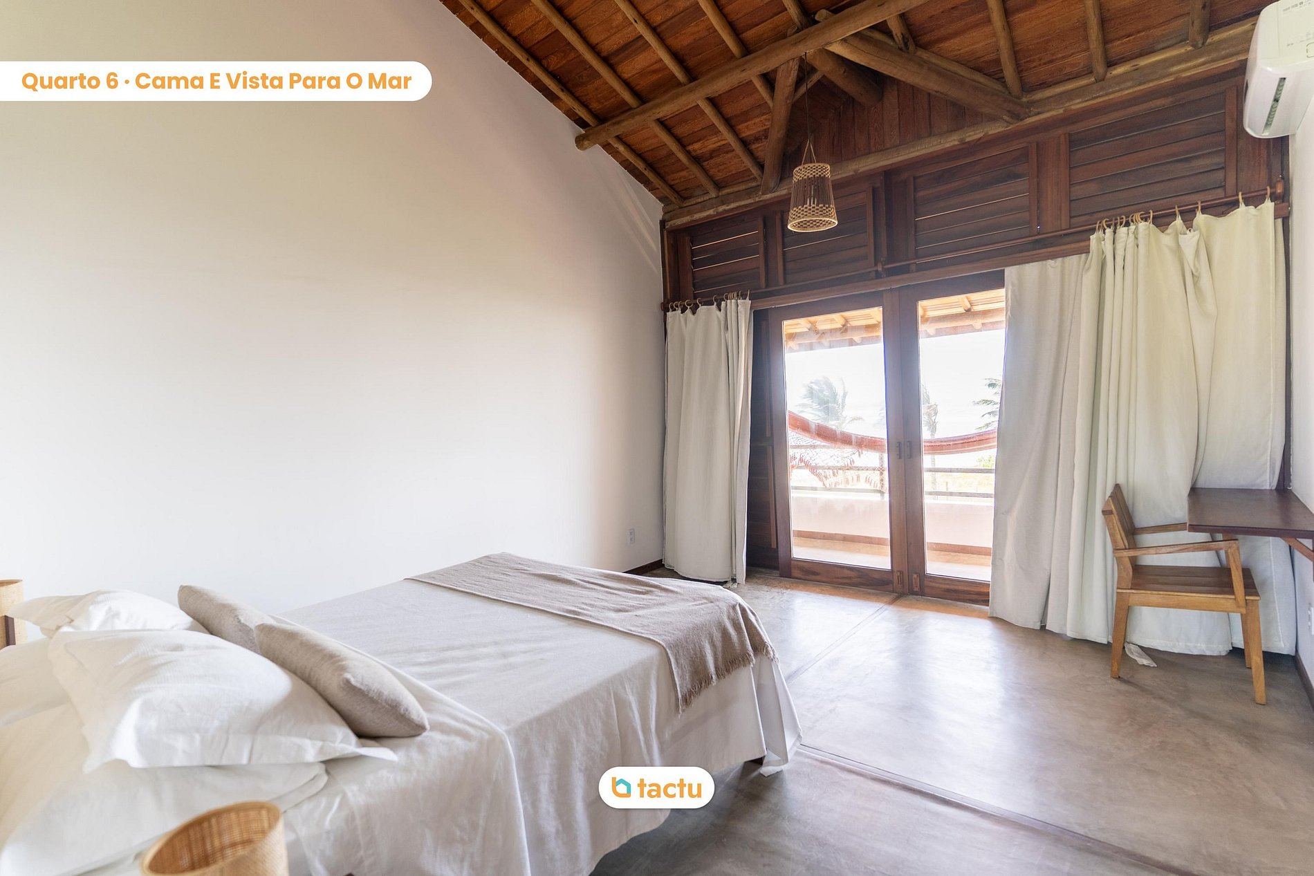 Com seis suítes espaçosas, todas climatizadas e decoradas com elementos naturais, a casa acolhe grupos e famílias que buscam tranquilidade, privacidade e experiências únicas à beira-mar. As suítes oferecem varandas com redes e vista para o mar ou para o jardim, garantindo conforto e harmonia em cada momento.