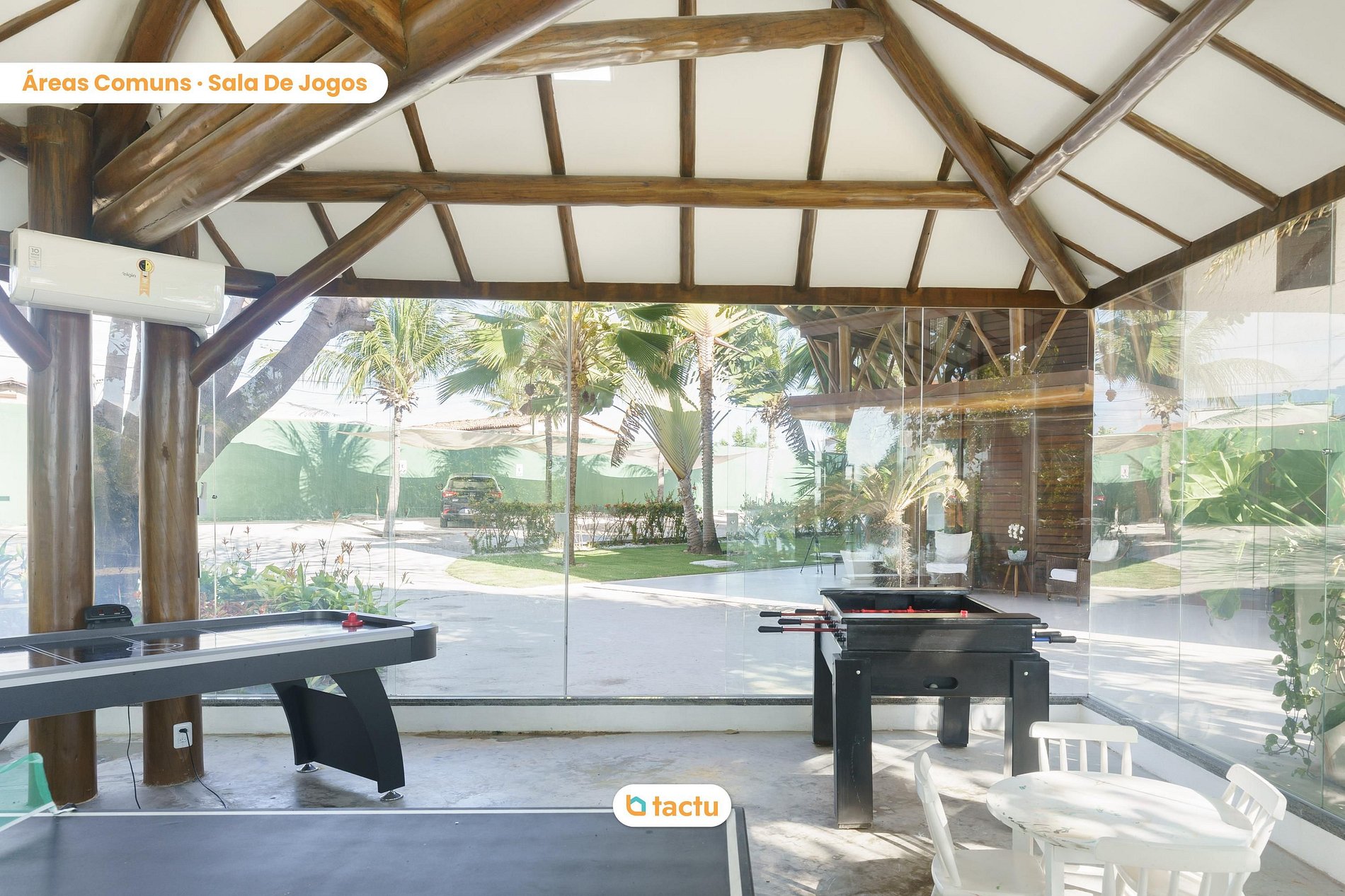 São 10 suítes e um quarto climatizados, todas confortáveis e bem decoradas, ideais para grandes grupos que buscam privacidade e comodidade. A casa dispõe ainda de academia completa, salão de jogos envidraçado e espaços internos que combinam sofisticação e aconchego, com mobiliário de alto padrão e decoração contemporânea.