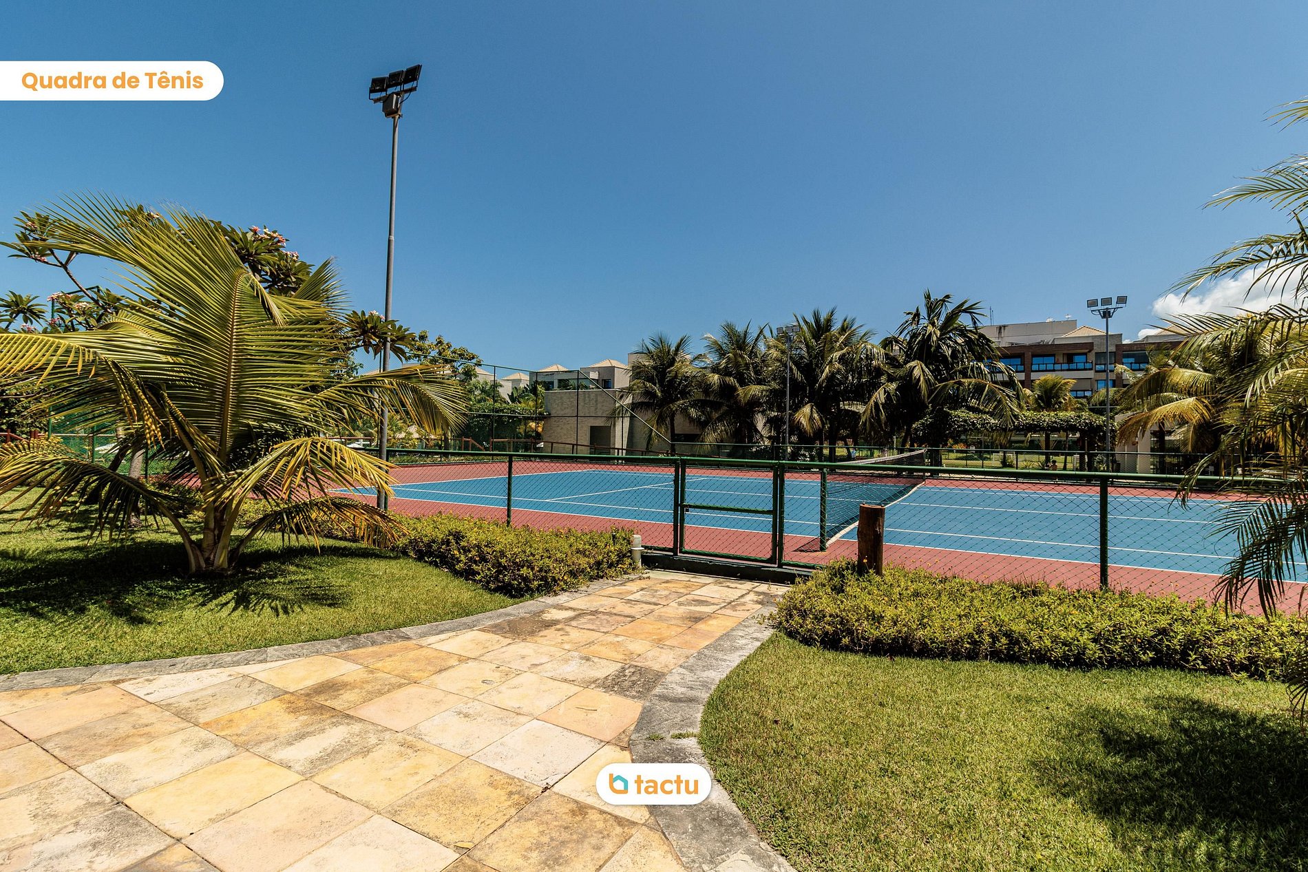 Campo gramado, quadra de tênis e de vôlei de praia