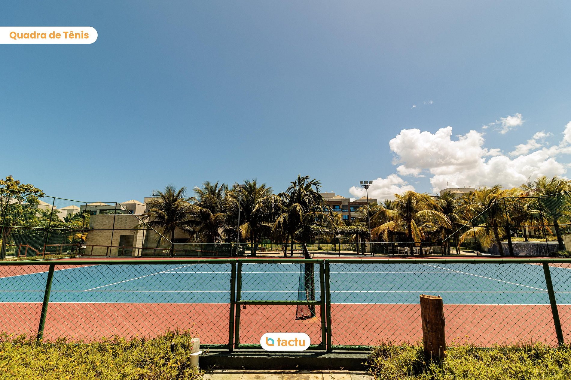 Campo gramado, quadra de tênis e de vôlei de praia