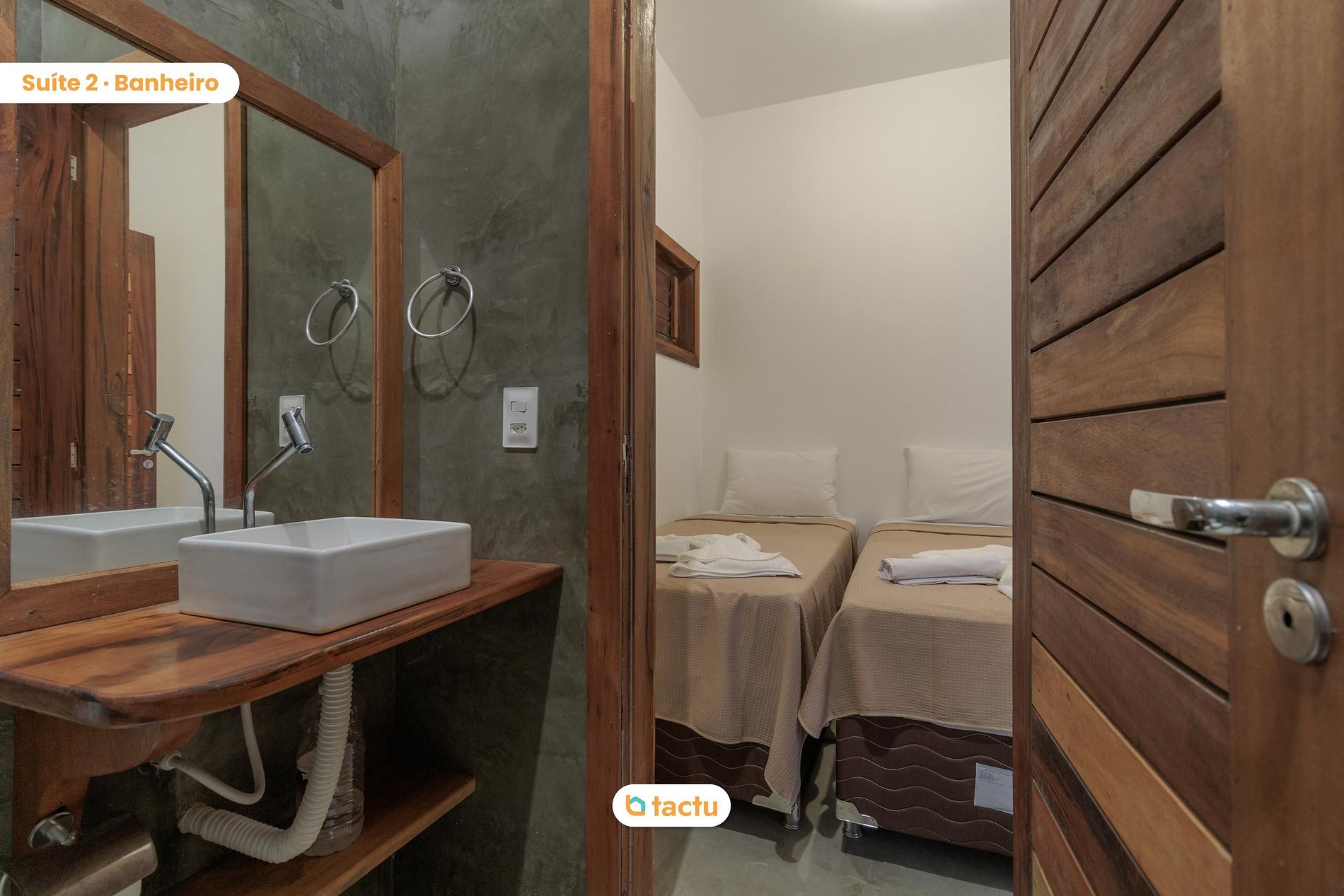 Ela possui 2 suítes, ambas climatizadas e renovadas, com pintura nova e decorações recentes! A suíte master conta com um colchão especial queen e uma TV enorme, onde a outra conta com duas camas de solteiro. Em ambos banheiros existem chuveiros elétricos que permitem um banho quentinho após um mergulho no mar ou na piscina.