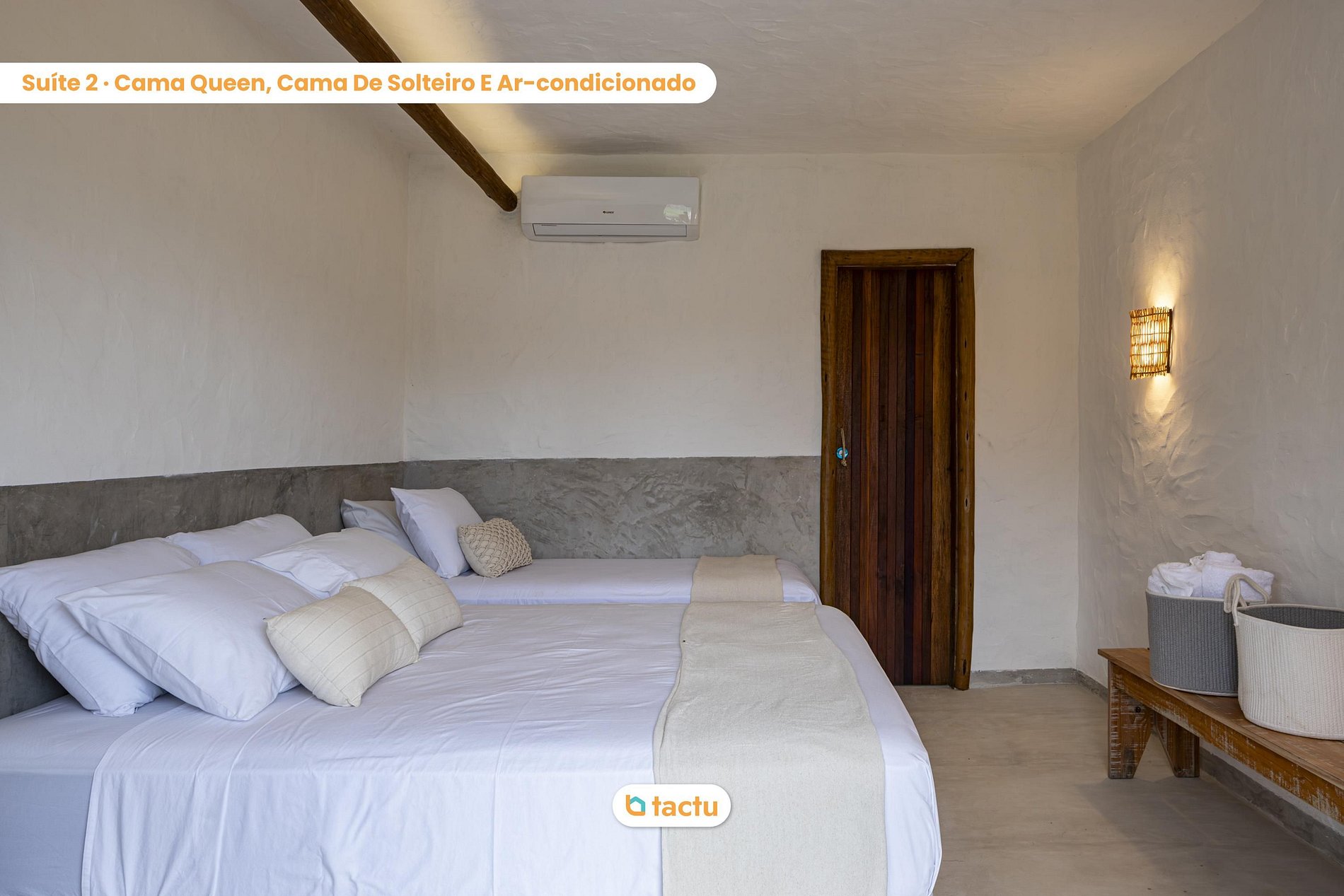 🛏️ Com duas suítes climatizadas, projetadas para garantir o máximo de conforto e privacidade, você poderá desfrutar de noites revigorantes. A Suíte Master, com uma luxuosa cama king-size e um colchão extra para hóspedes adicionais, e a Suíte 2, equipada com uma cama queen-size e uma cama de solteiro, proporcionam o ambiente perfeito para relaxar após um dia de aventuras.