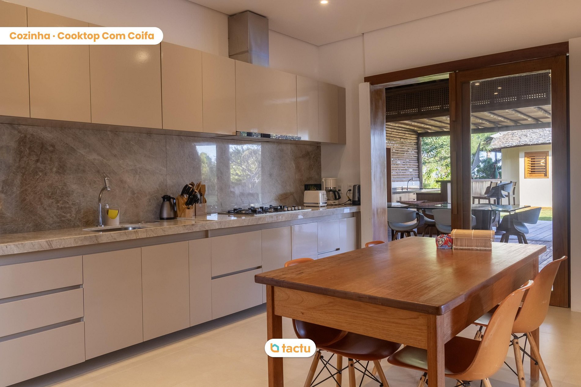 A propriedade conta com duas cozinhas: uma principal, totalmente equipada, e uma de apoio para maior praticidade. Na varanda, uma sala de jantar com vista para a piscina cria o ambiente perfeito para as refeições em família.