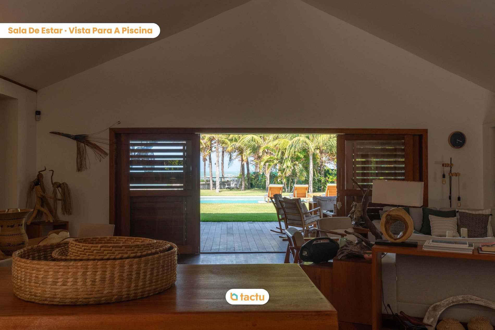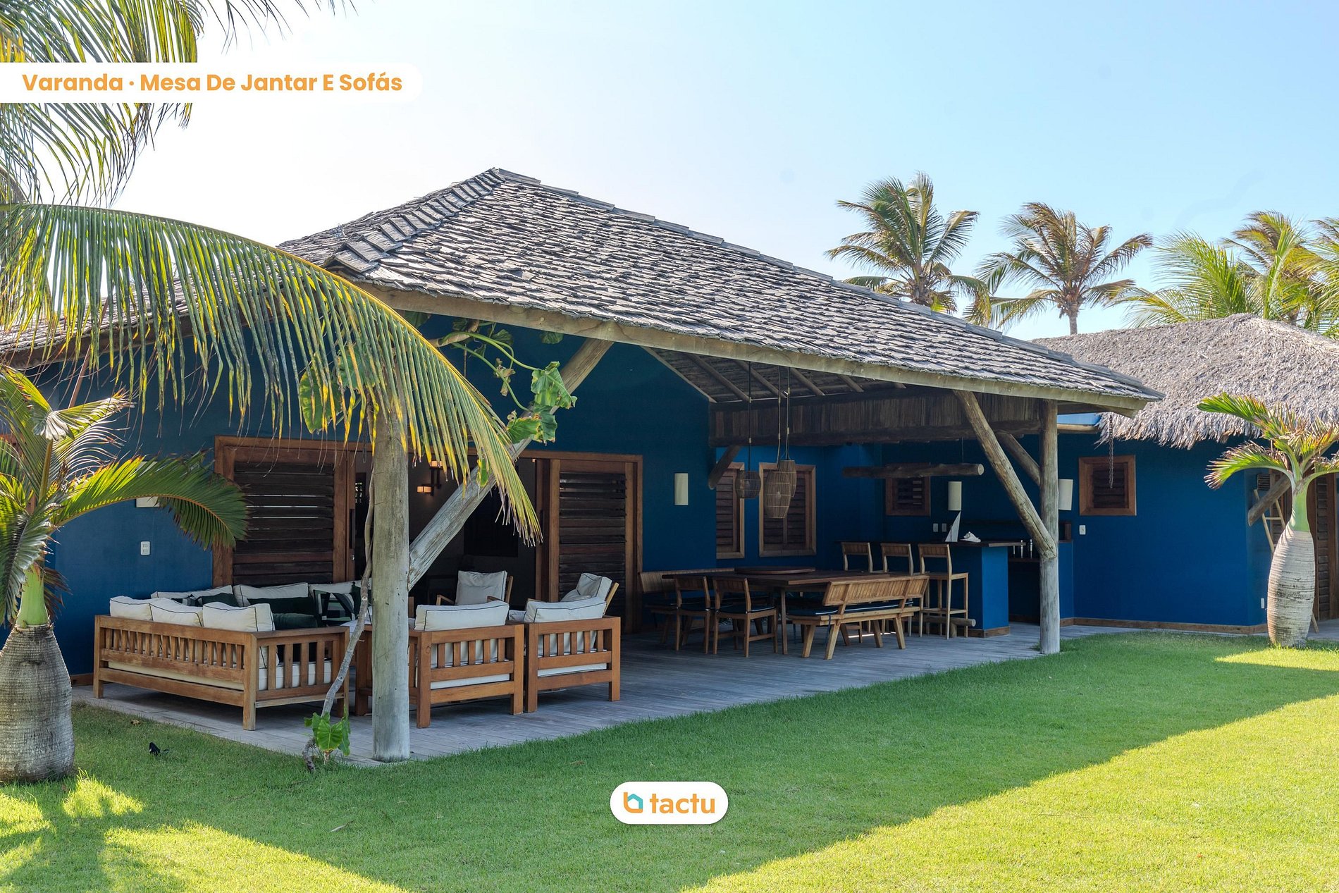 A fachada da villa é encantadora, com telhado de palha e elementos em madeira, integrando-se perfeitamente ao ambiente natural. A casa conta com uma cozinha completa, equipada com todos os utensílios e equipamentos necessários para proporcionar praticidade e conforto aos hóspedes. Além disso, oferece oito suítes, todas climatizadas e projetadas para garantir o máximo de bem-estar.