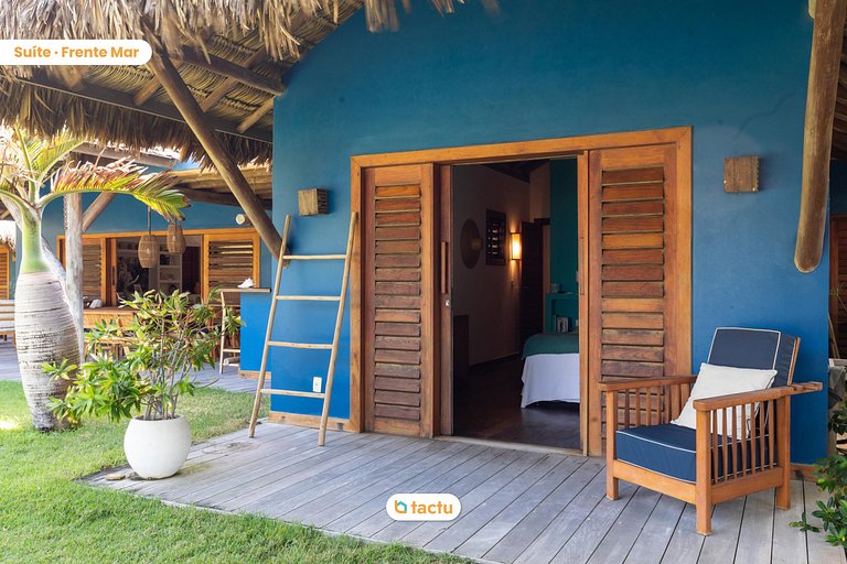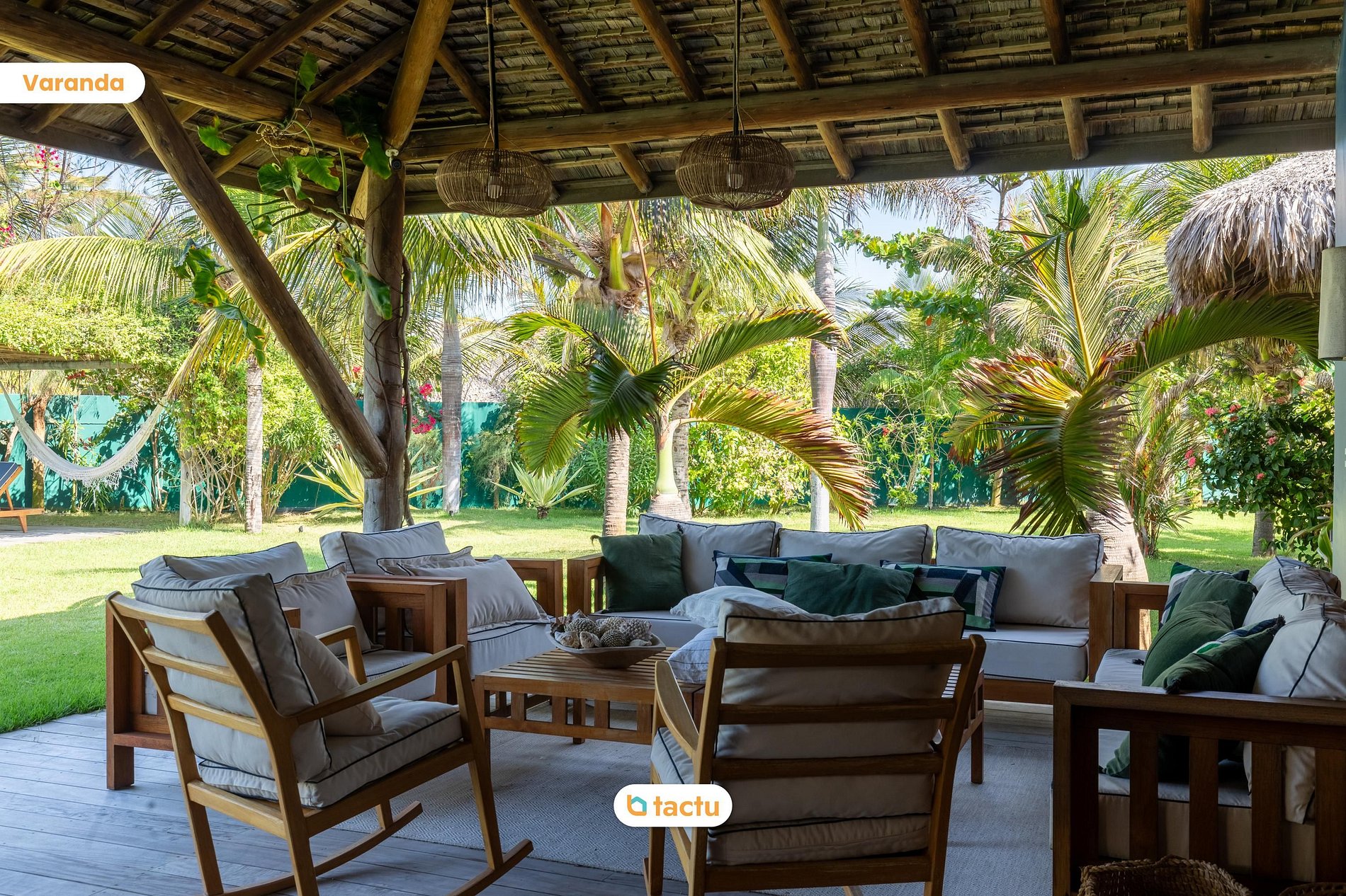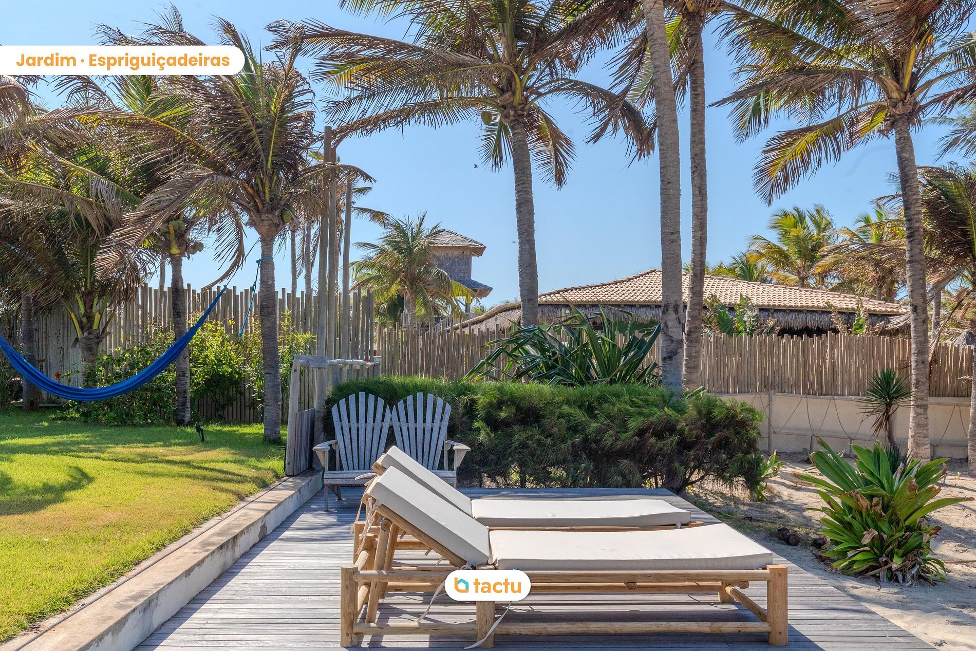 O jardim espaçoso, repleto de coqueiros e plantas tropicais, cria uma atmosfera de paz e privacidade. A poucos passos do mar, a villa oferece uma vista deslumbrante e ininterrupta do oceano e conta com acesso privativo à praia, garantindo uma experiência exclusiva e tranquila. As áreas de descanso, que incluem redes e cadeiras dispostas estrategicamente, permitem que os hóspedes relaxem ao som das ondas e aproveitem a brisa fresca.