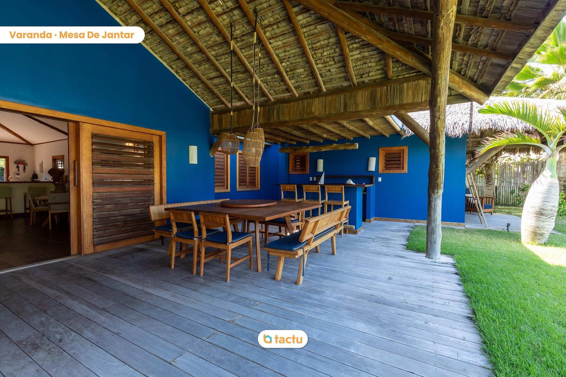 A fachada da villa é encantadora, com telhado de palha e elementos em madeira, integrando-se perfeitamente ao ambiente natural. A casa conta com uma cozinha completa, equipada com todos os utensílios e equipamentos necessários para proporcionar praticidade e conforto aos hóspedes. Além disso, oferece oito suítes, todas climatizadas e projetadas para garantir o máximo de bem-estar.