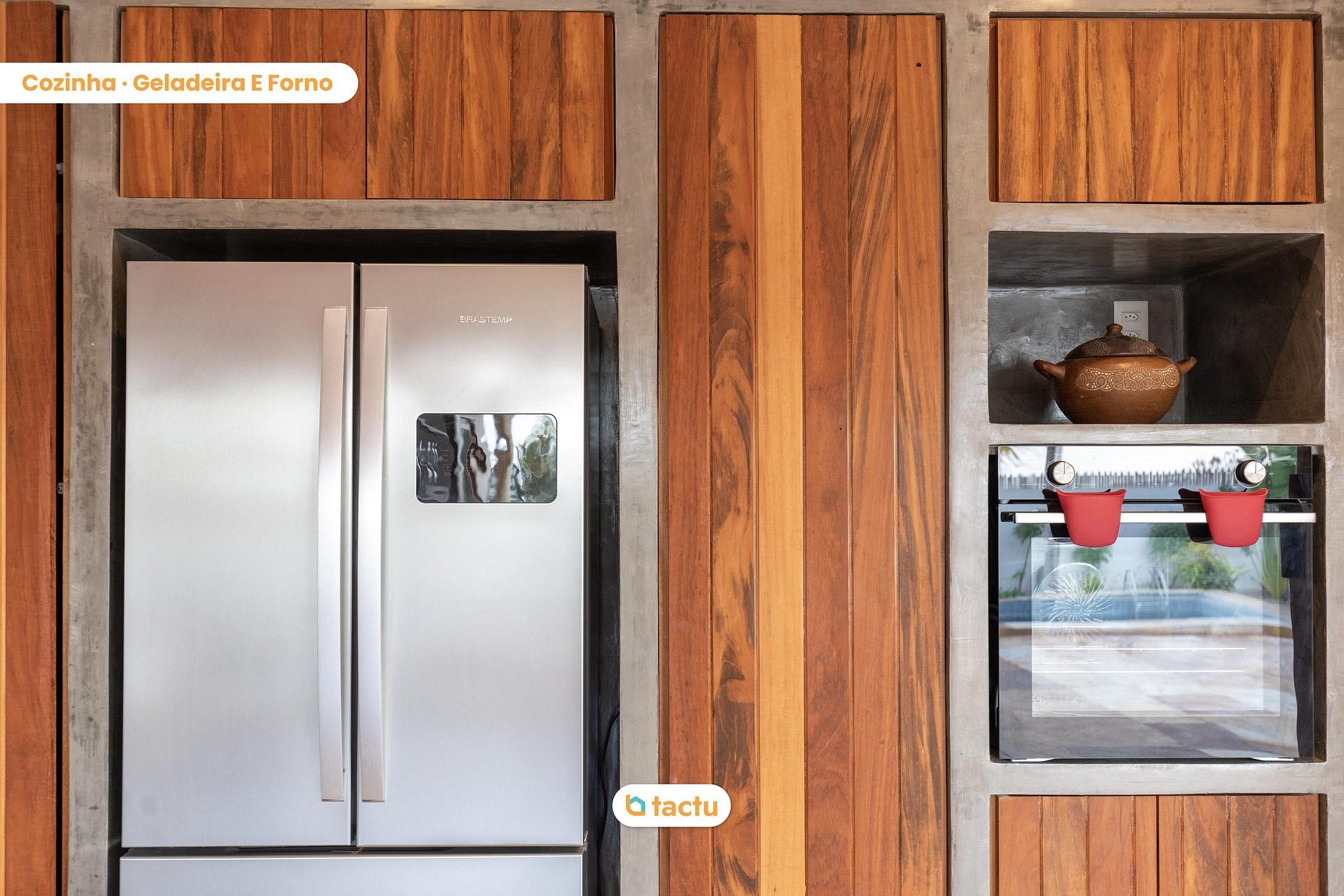 A cozinha completa e equipada é ideal para preparar refeições especiais, seja um café da manhã ou um jantar com amigos. No coração do espaço externo, uma piscina convidativa está cercada por um deck espaçoso, perfeito para relaxar ao sol ou aproveitar momentos de lazer com a família.