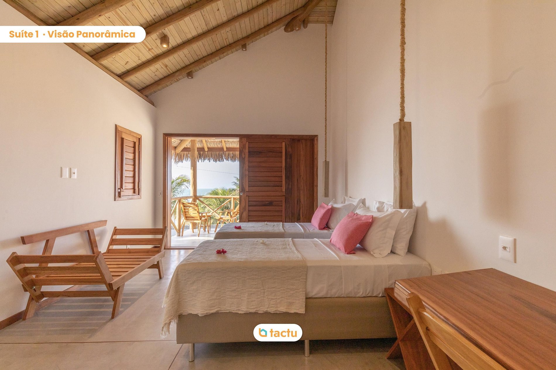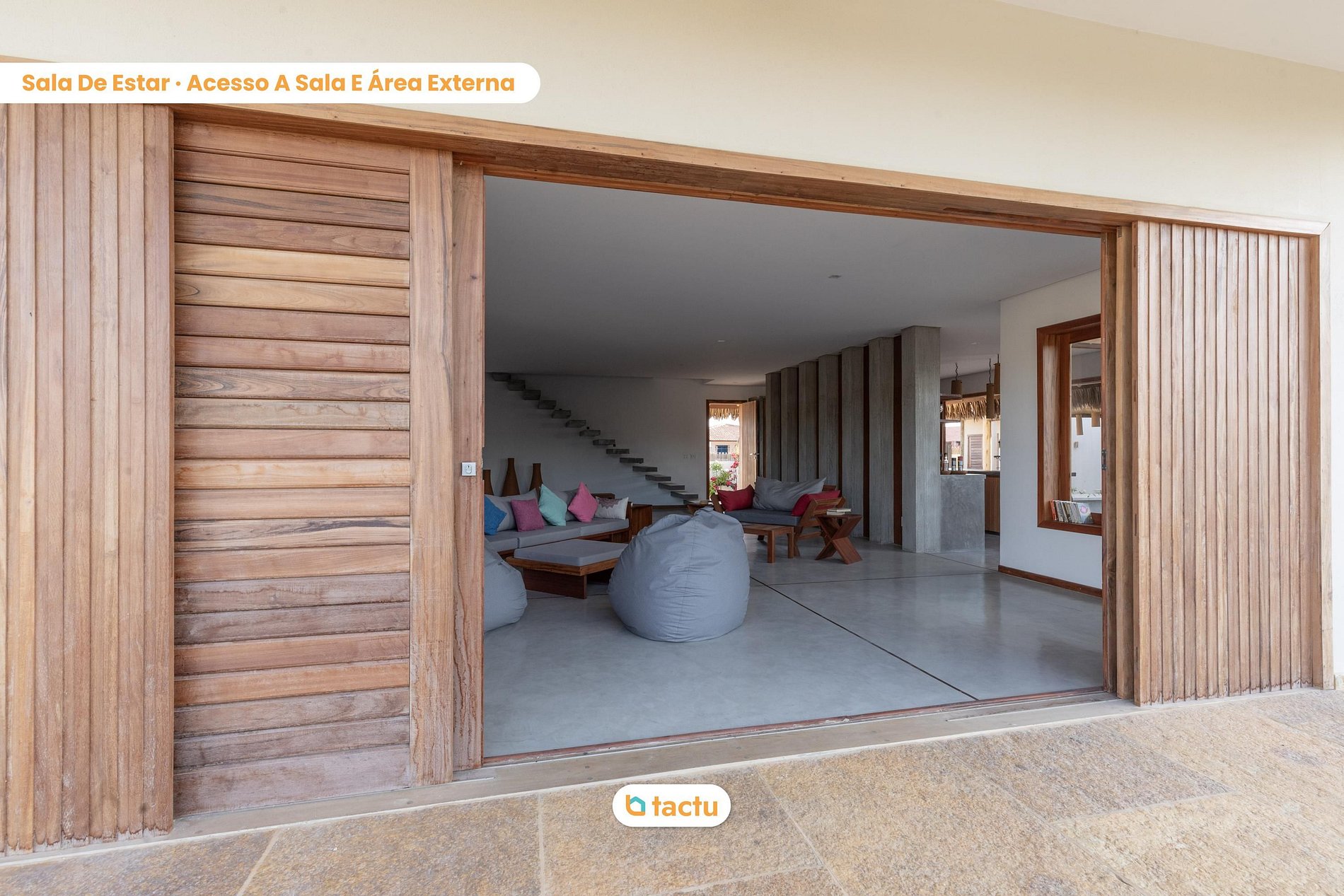 A casa Kitepitinha combina sofisticação rústica e conforto absoluto. Com 4 suítes amplas, todas com vista para o mar, ela oferece o equilíbrio perfeito entre privacidade e conexão com a natureza. A sala de estar é iluminada por luz natural, com portas e janelas em madeira que se abrem para um jardim tropical encantador.