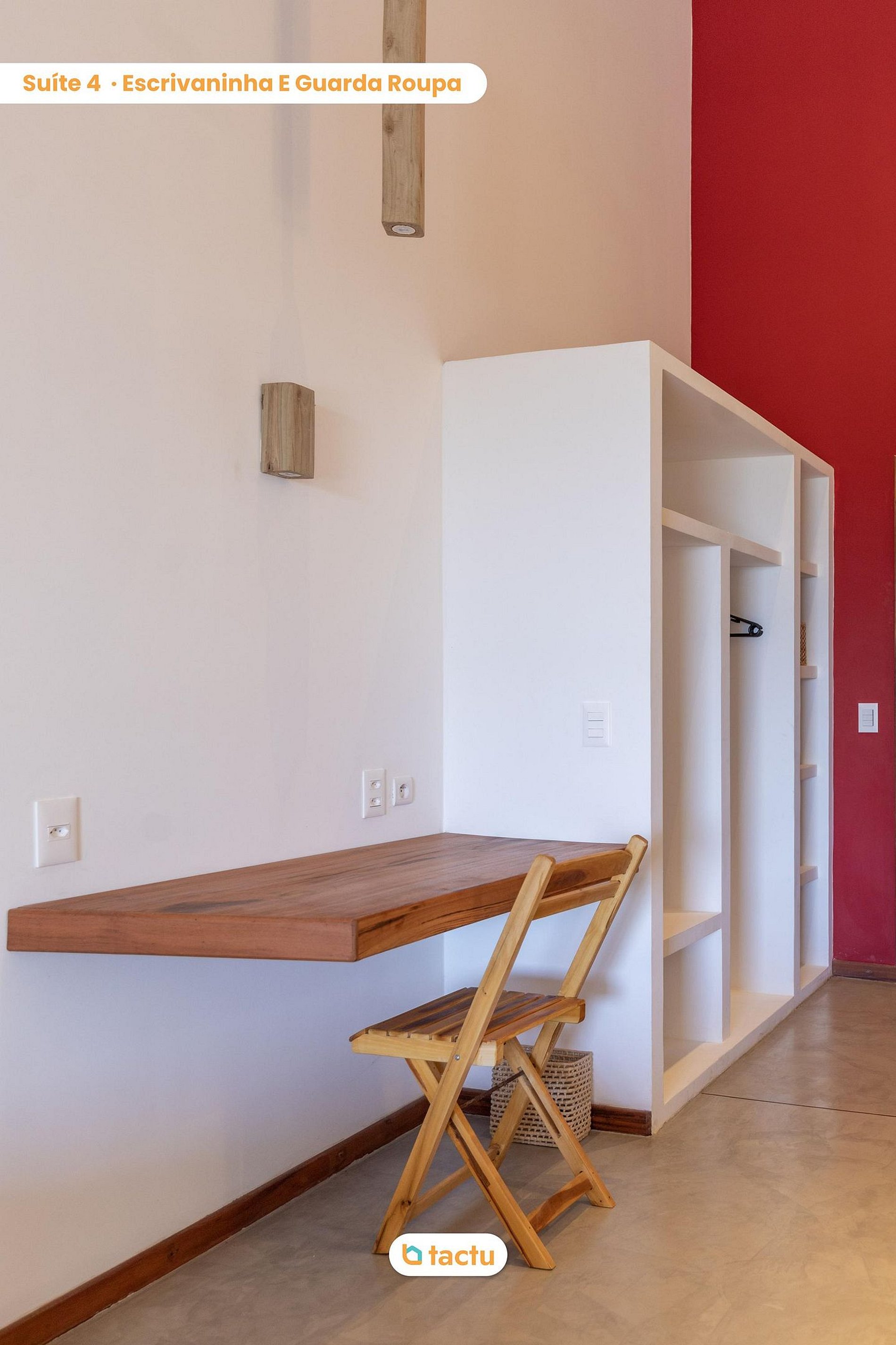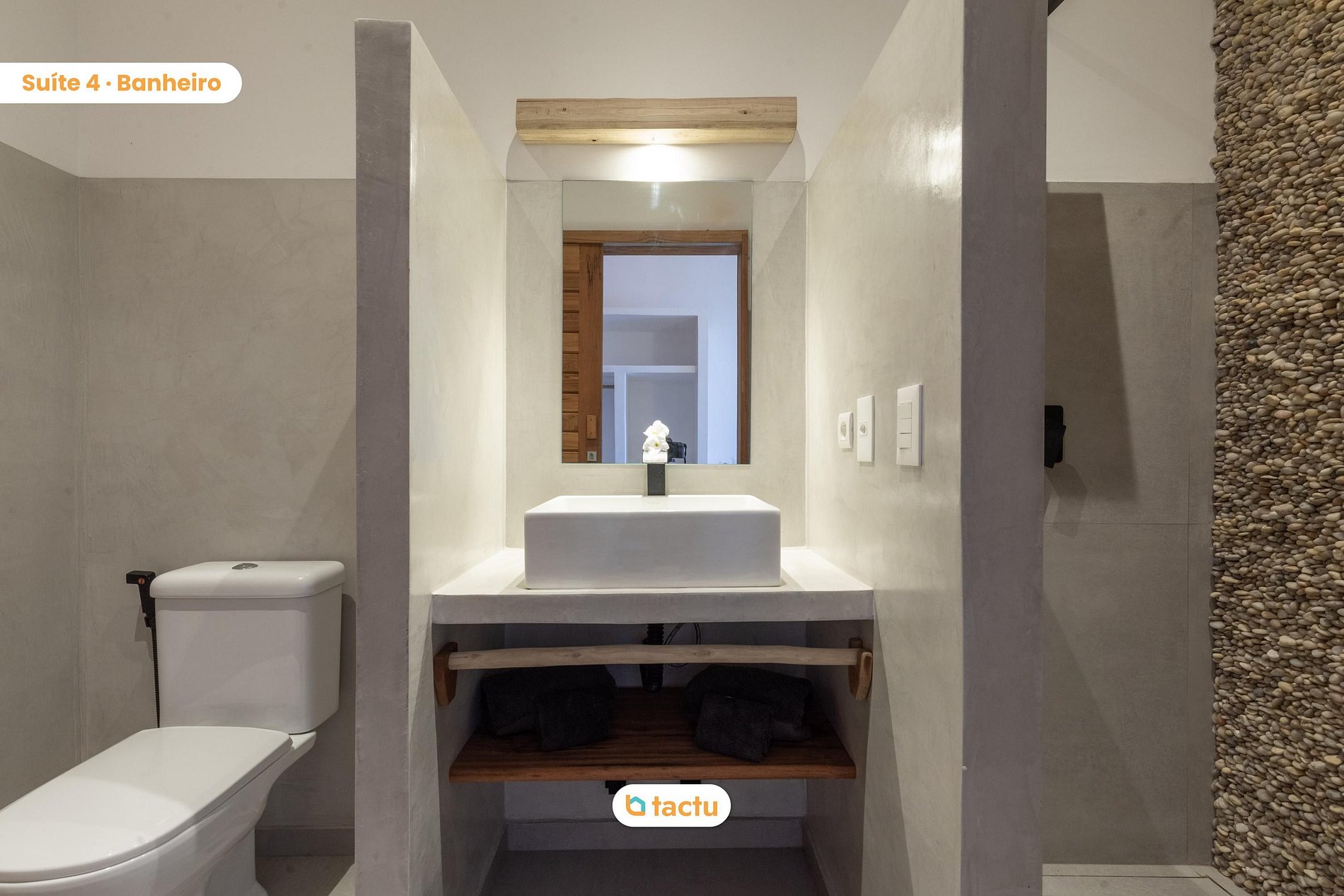 Os banheiros apresentam um design único, com detalhes em pedras naturais que remetem à beleza do litoral. E para completar, a área de convivência ao ar livre oferece um espaço charmoso para refeições e encontros, cercado pela brisa constante do mar.