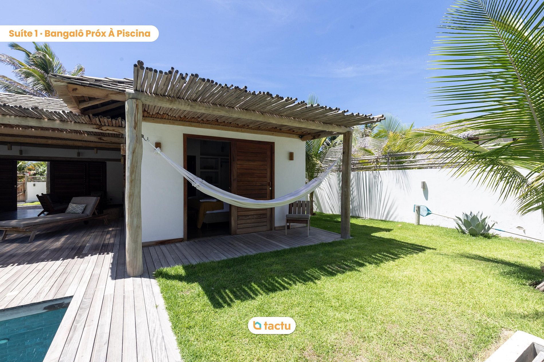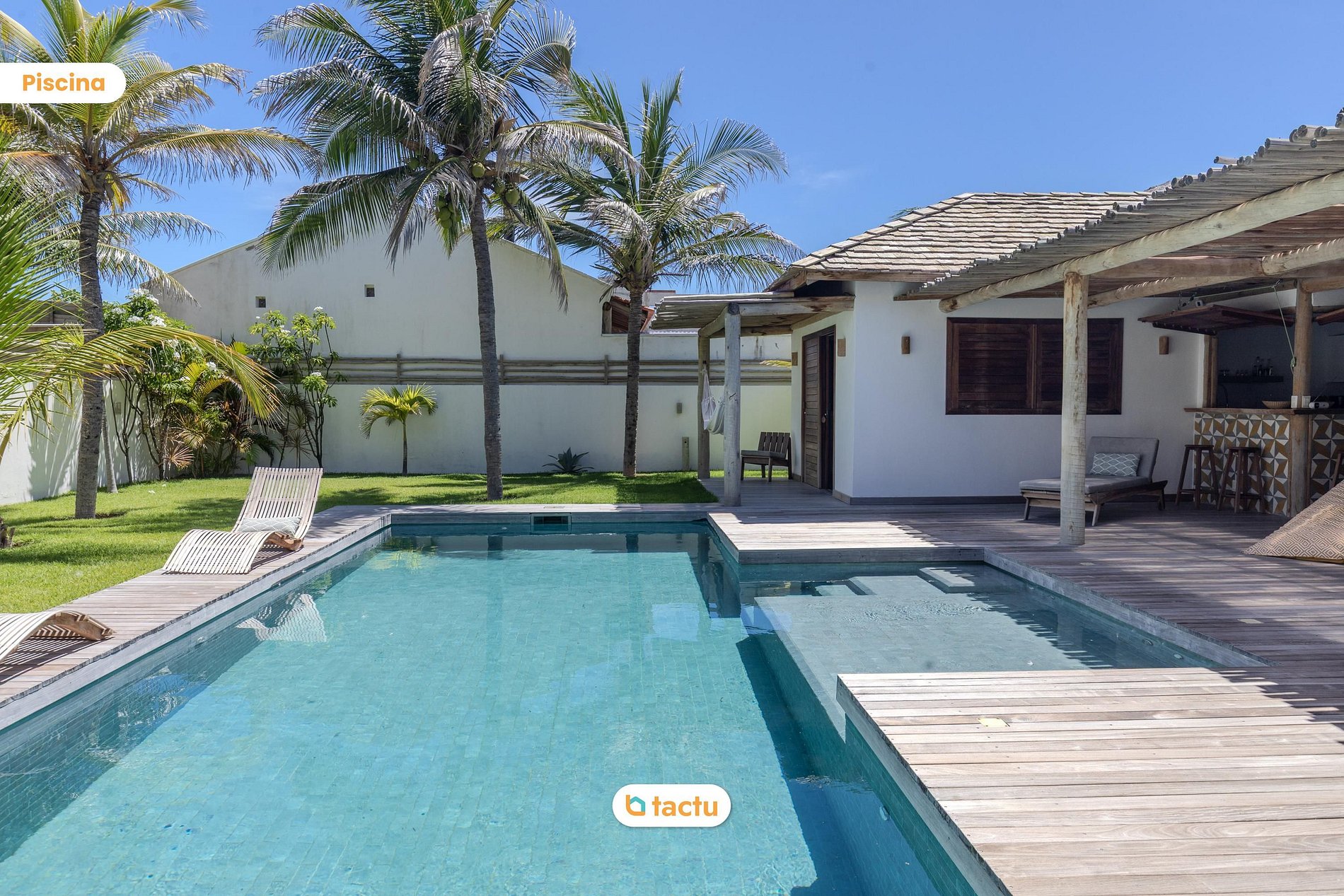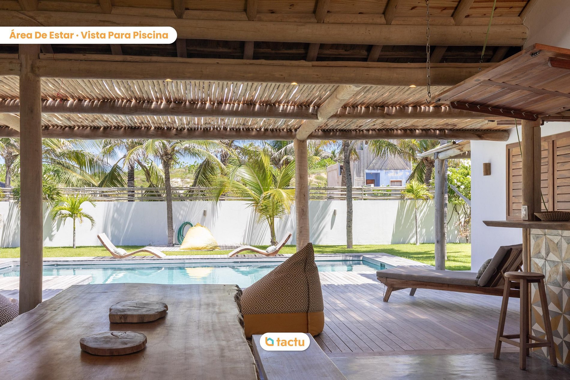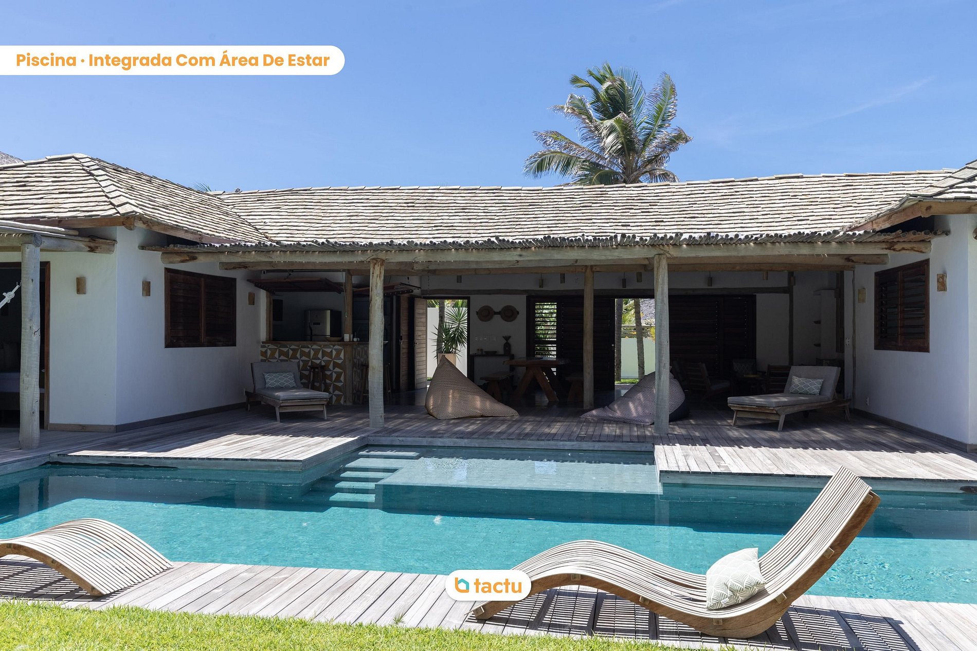 Do lado de fora, a área de lazer é o grande destaque: piscina privativa com deck de madeira, espreguiçadeiras e um ambiente perfeito para relaxar sob o sol. A varanda coberta convida a momentos de descanso, com redes, poltronas e mesa para refeições ao ar livre.