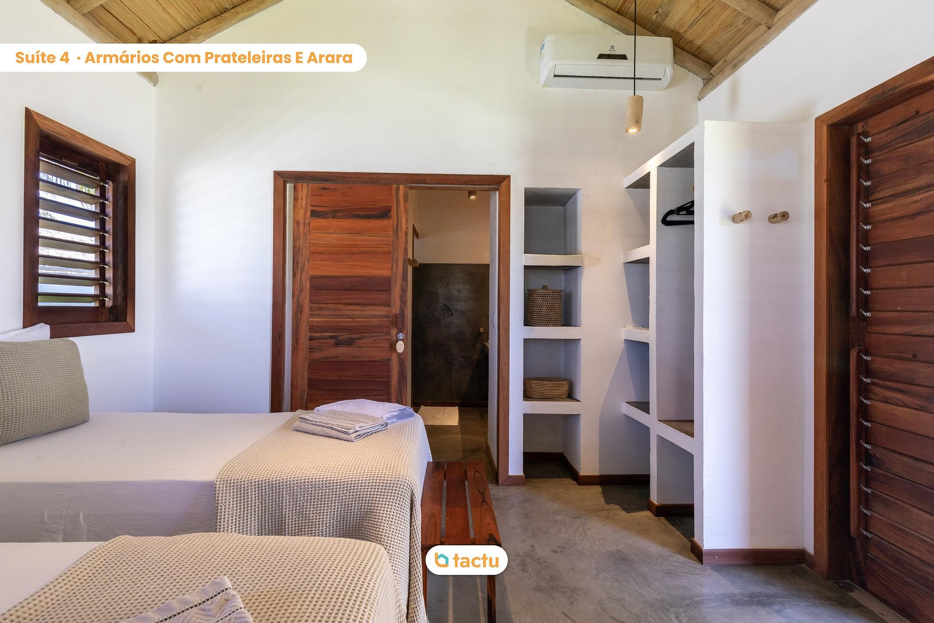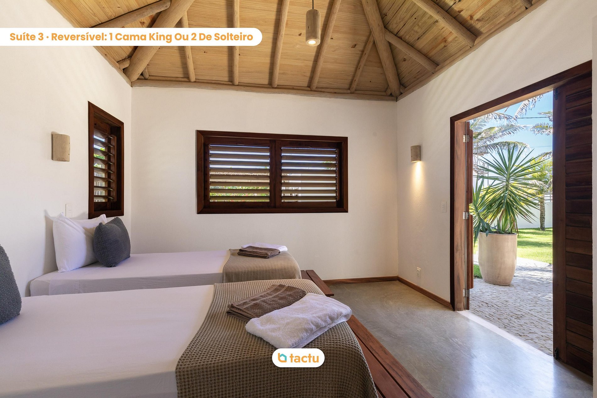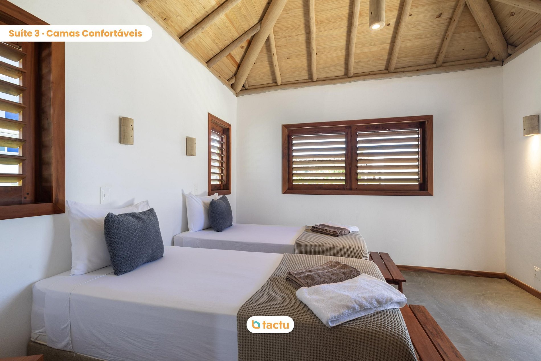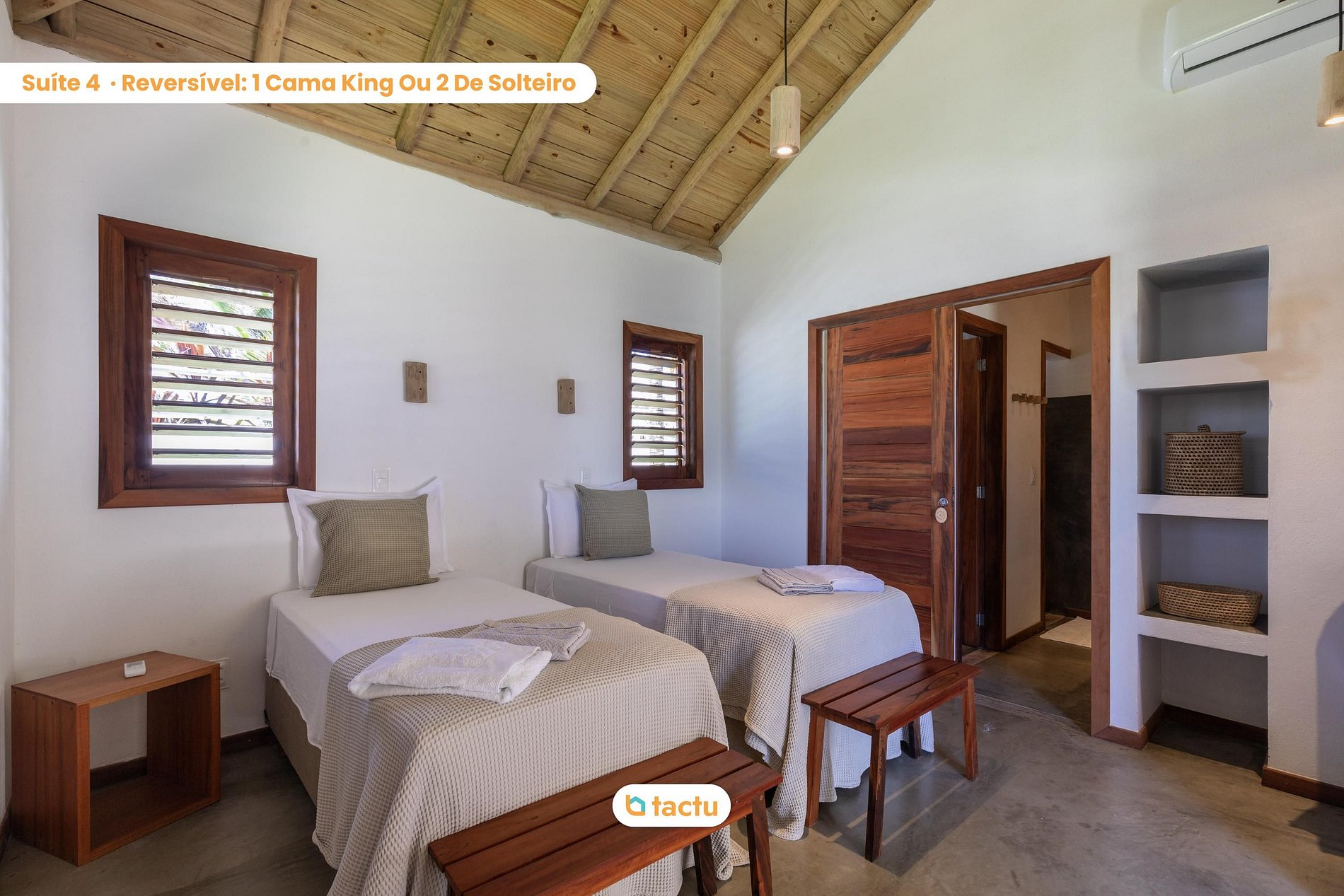 A casa conta com quatro suítes confortáveis, todas com entrada independente para o exterior da casa e equipadas com ar-condicionado. Duas dessas suítes são versáteis, podendo ser preparadas com cama king ou duas camas de solteiro, ideais para famílias ou grupos de amigos. Elas compartilham um banheiro amplo e funcional. As outras duas suítes são equipadas com cama king size e oferecem total privacidade e conforto.