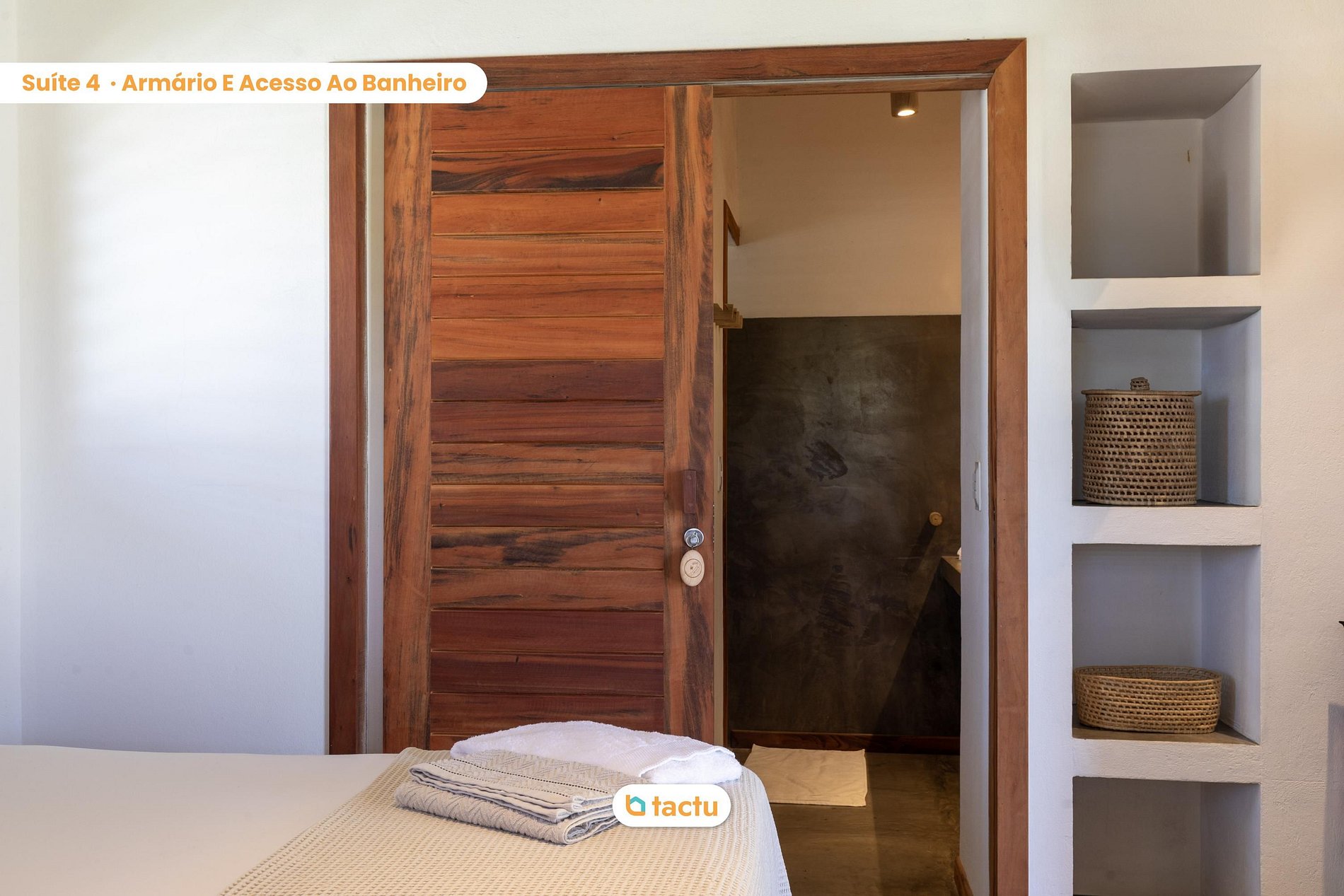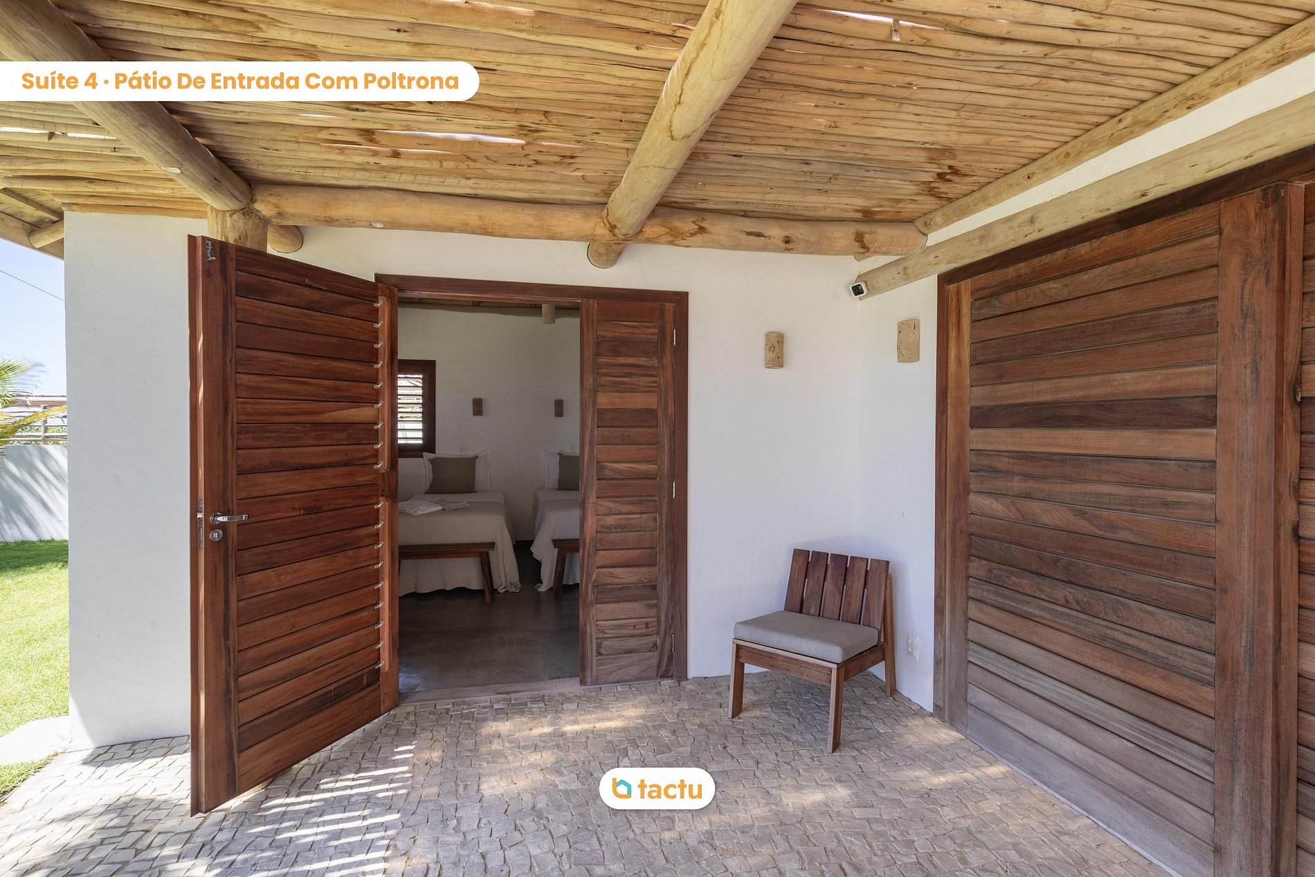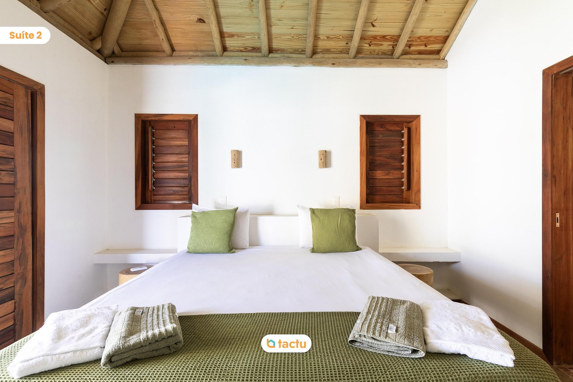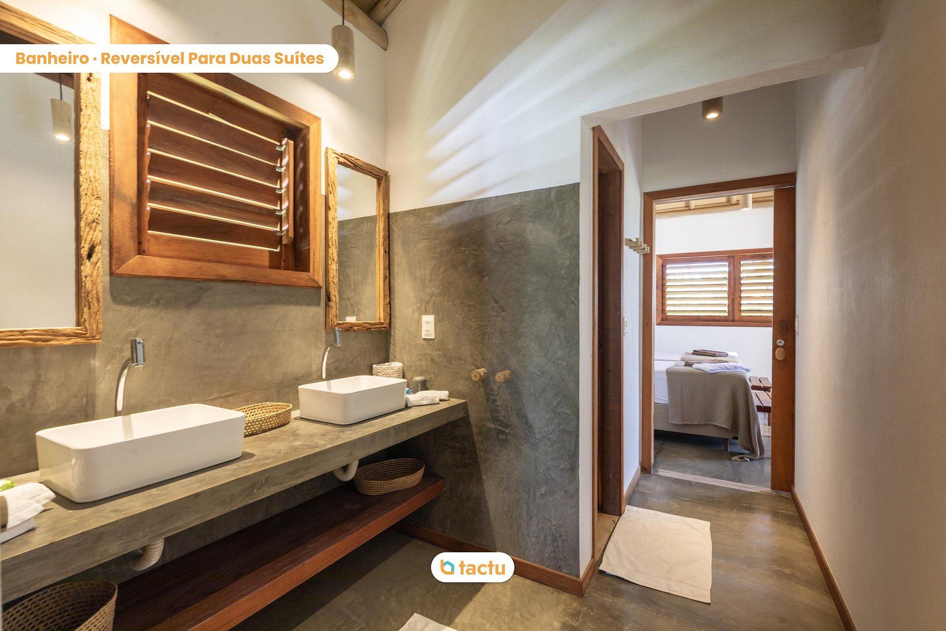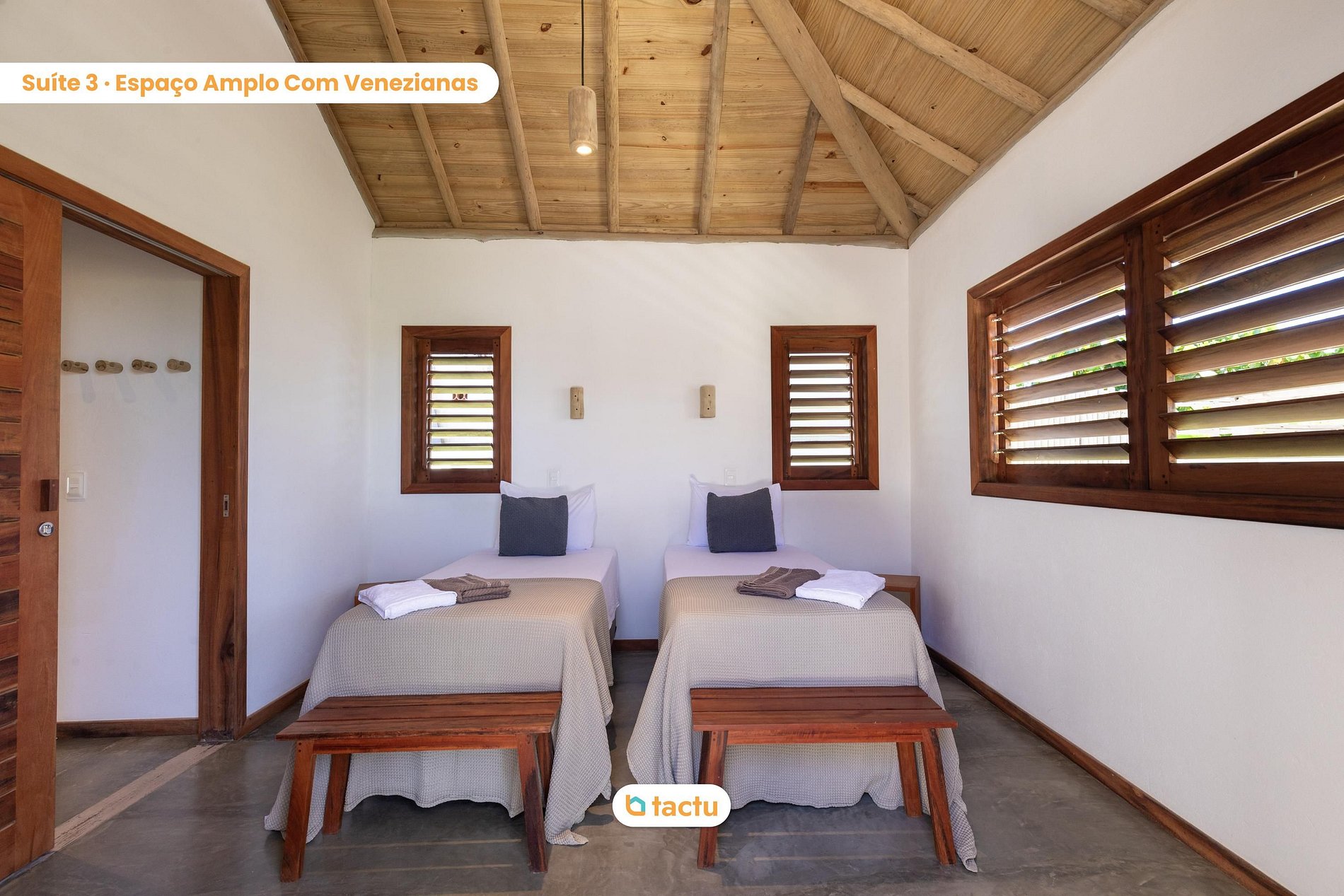 A casa conta com quatro suítes confortáveis, todas com entrada independente para o exterior da casa e equipadas com ar-condicionado. Duas dessas suítes são versáteis, podendo ser preparadas com cama king ou duas camas de solteiro, ideais para famílias ou grupos de amigos. Elas compartilham um banheiro amplo e funcional. As outras duas suítes são equipadas com cama king size e oferecem total privacidade e conforto.