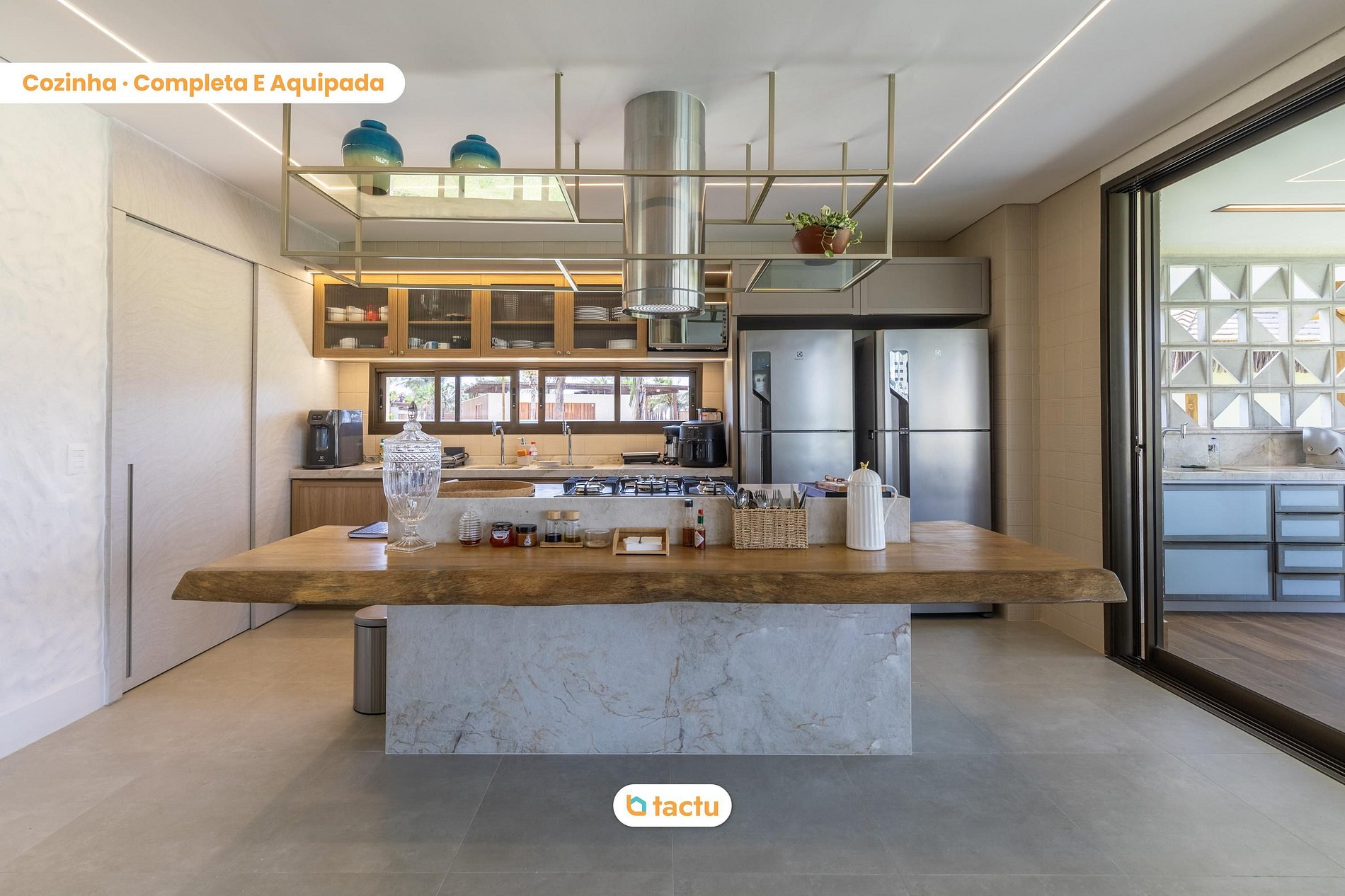A casa dispõe de 6 suítes climatizadas (sendo 5 amplas suítes e 1 dependência), piscina privativa, rooftop com varanda panorâmica e cozinha completa equipada com utensílios e eletrodomésticos premium. Os ambientes integrados contam com área gourmet, sofás confortáveis e decoração contemporânea, criando o cenário ideal para receber família e amigos com conforto e sofisticação.