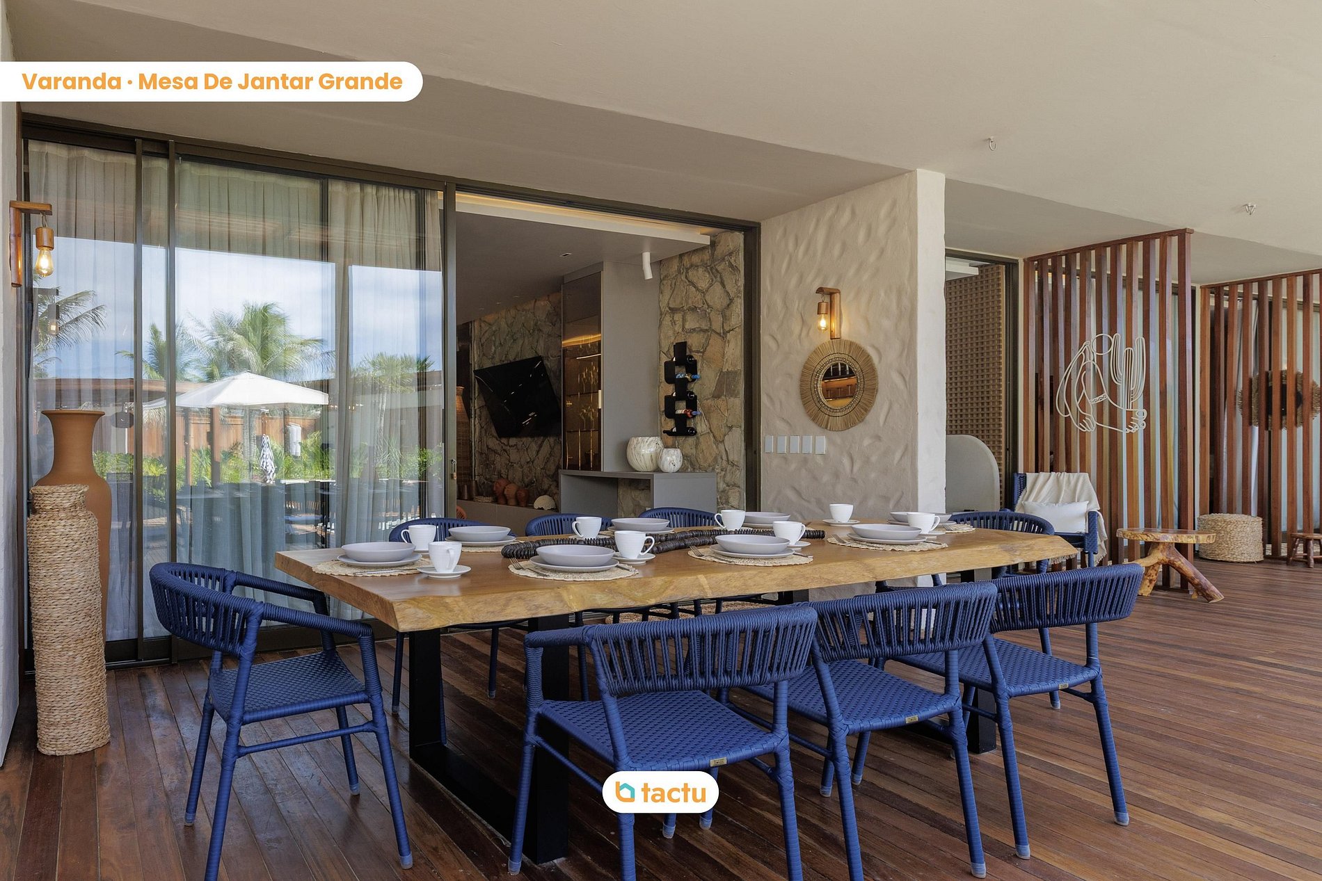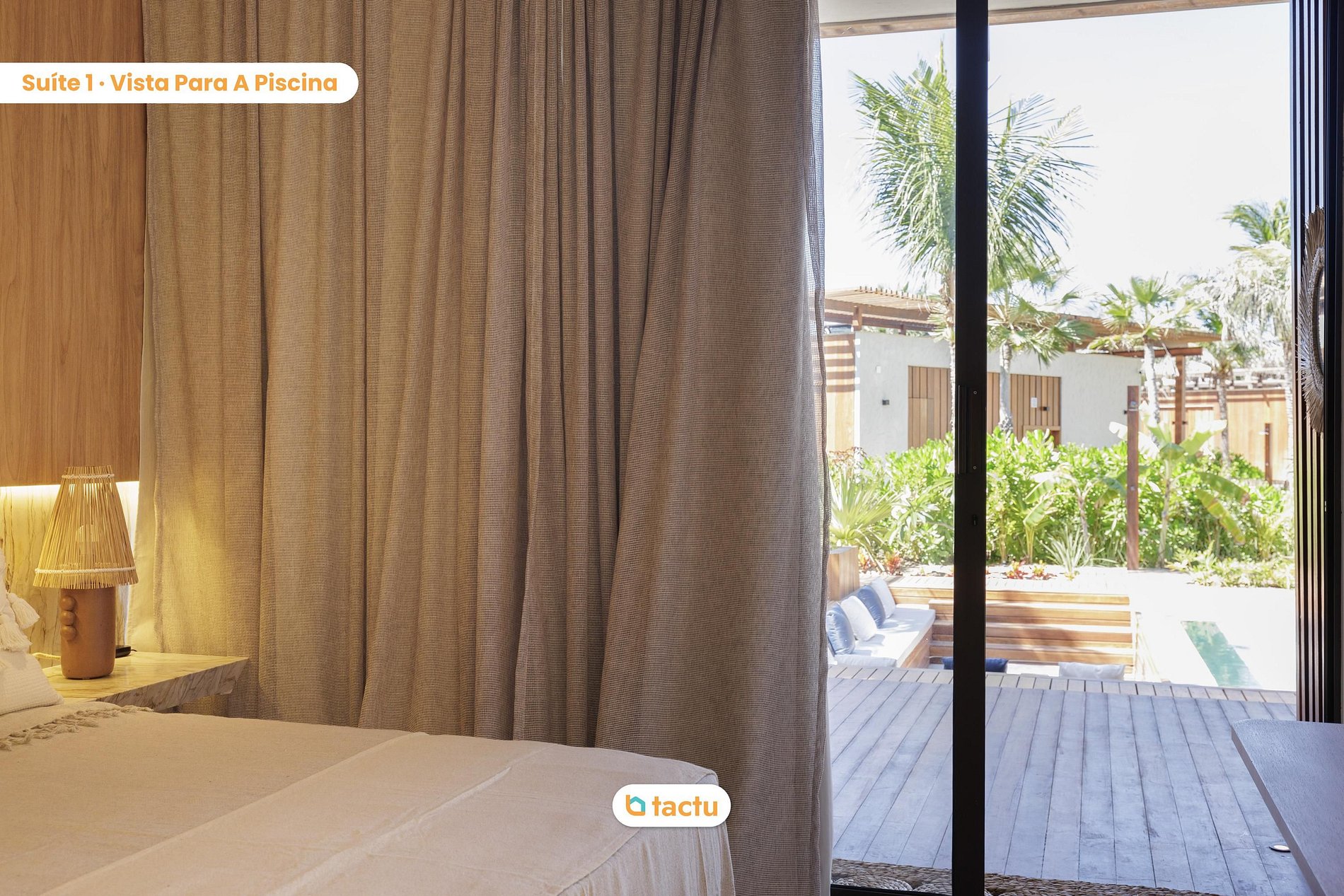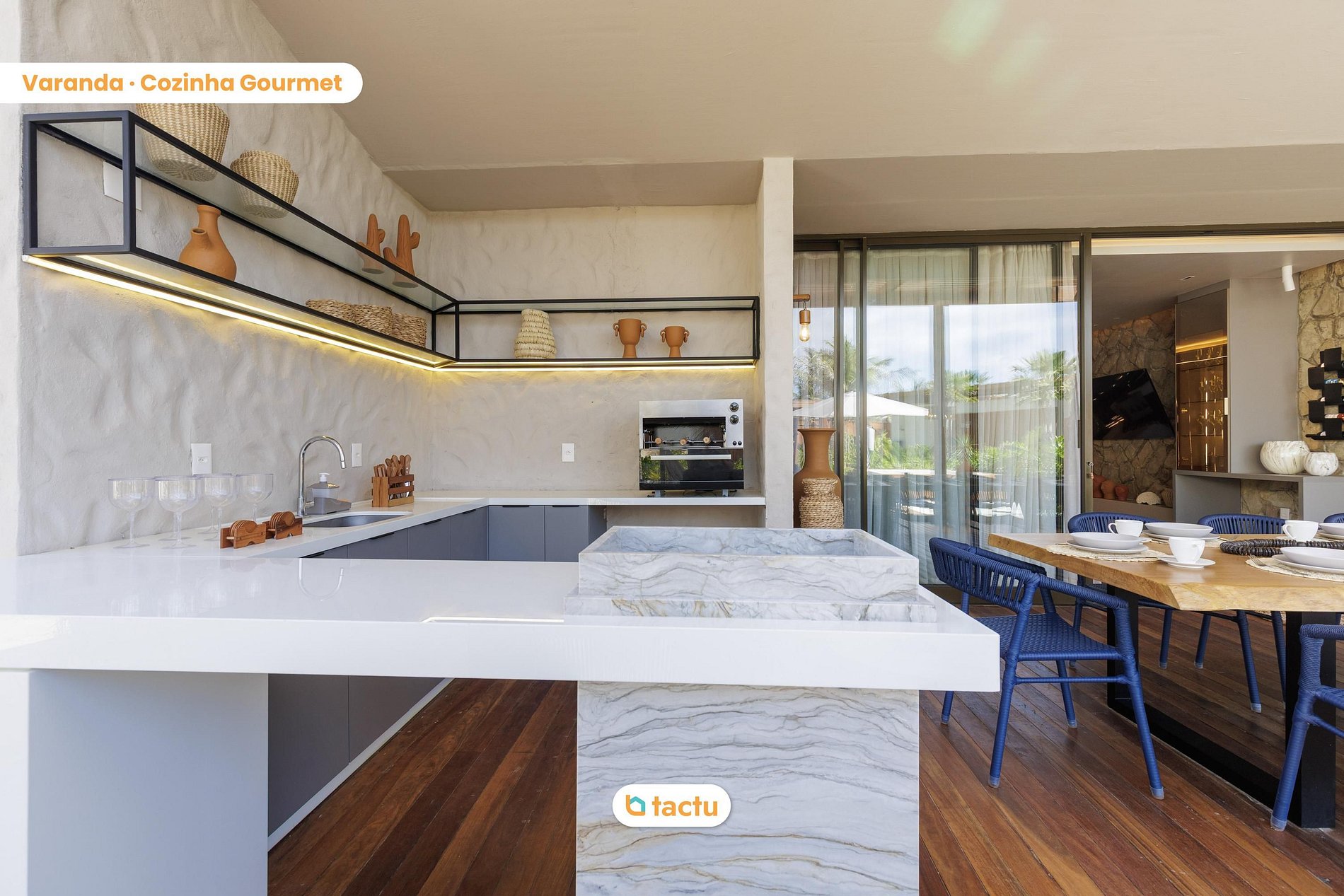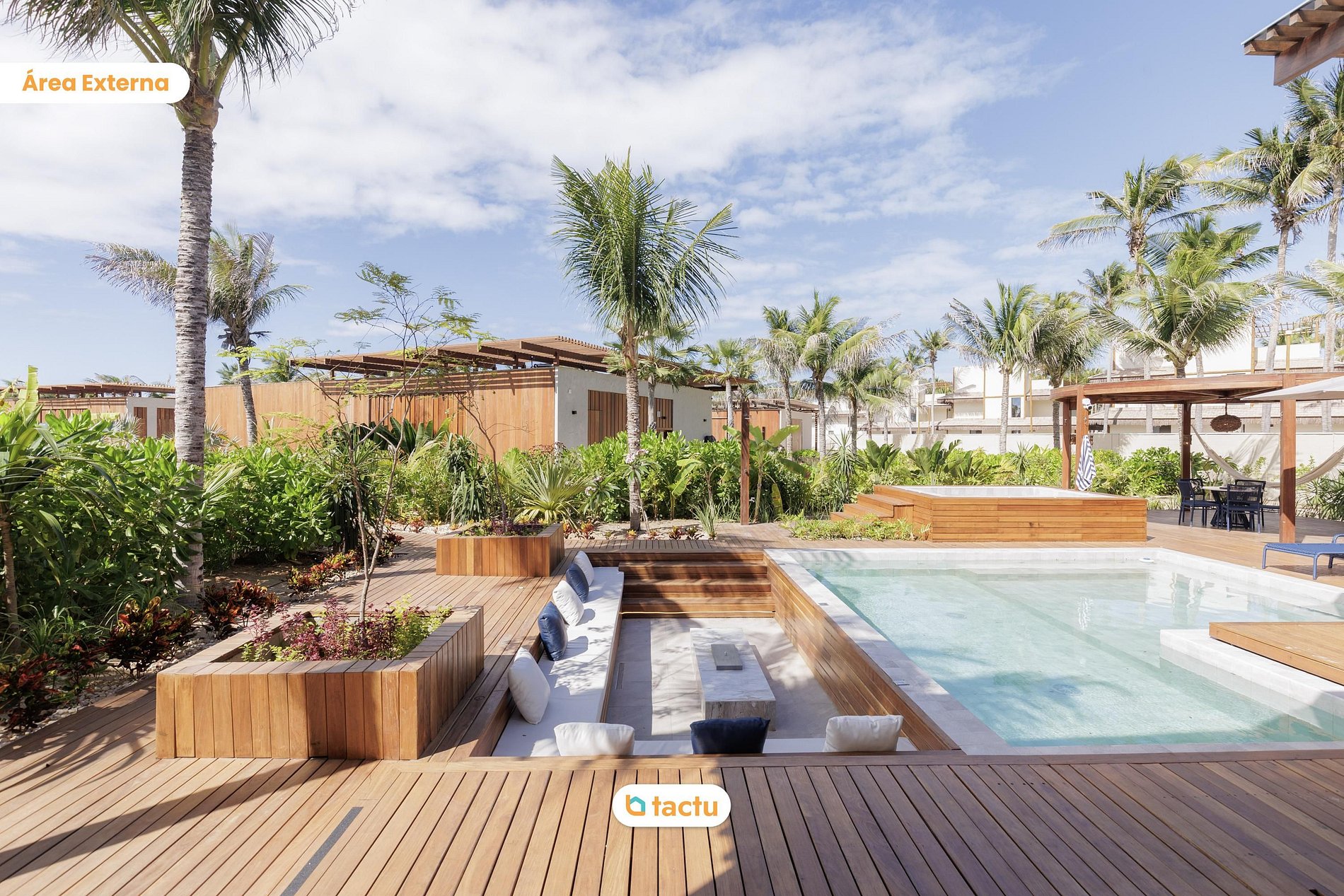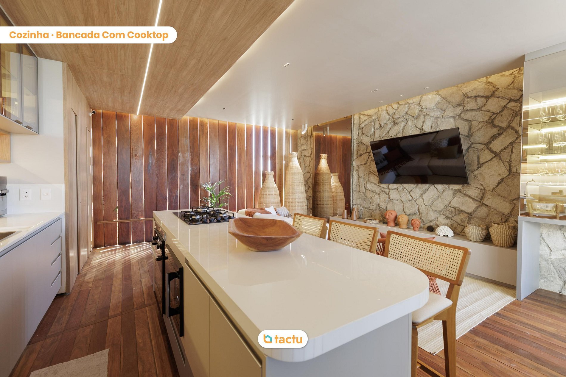 A sala de estar, integrada com a cozinha, conta com paredes de brises de madeira, permitindo a circulação de ar e iluminação natural, criando um ambiente fresco e acolhedor. Com segurança 24h e fácil acesso à praia, você terá tudo o que precisa para vivenciar o melhor de Fortim com o conforto e a exclusividade da Tactu.
