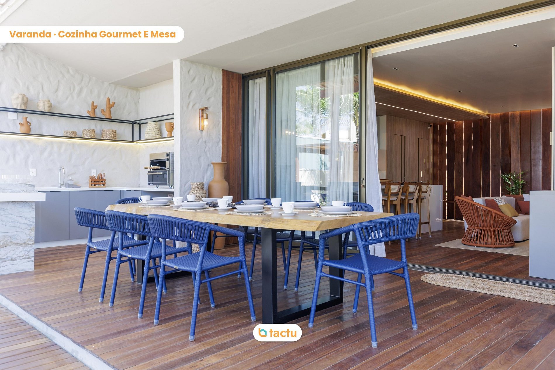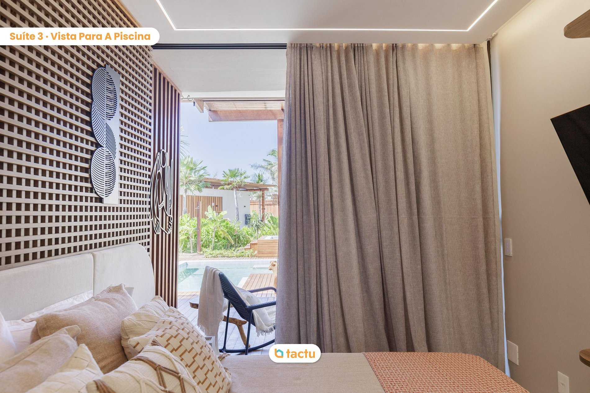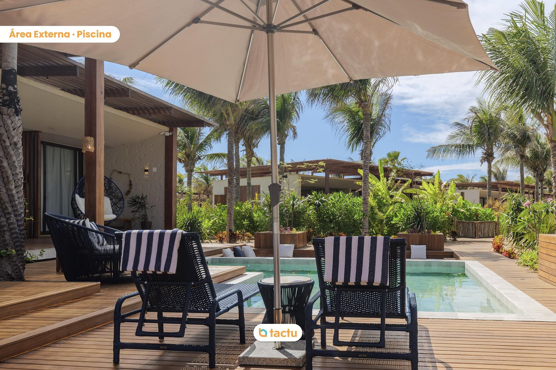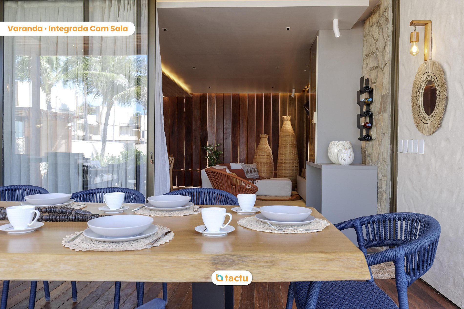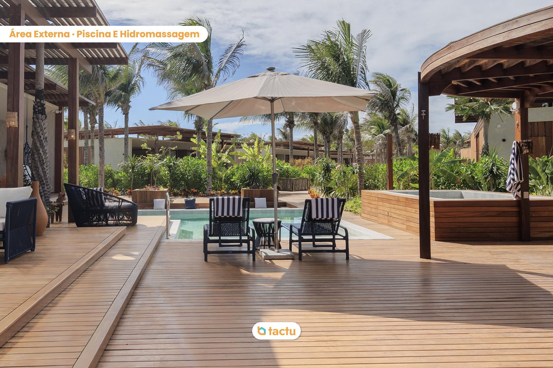 A sala de estar, integrada com a cozinha, conta com paredes de brises de madeira, permitindo a circulação de ar e iluminação natural, criando um ambiente fresco e acolhedor. Com segurança 24h e fácil acesso à praia, você terá tudo o que precisa para vivenciar o melhor de Fortim com o conforto e a exclusividade da Tactu.