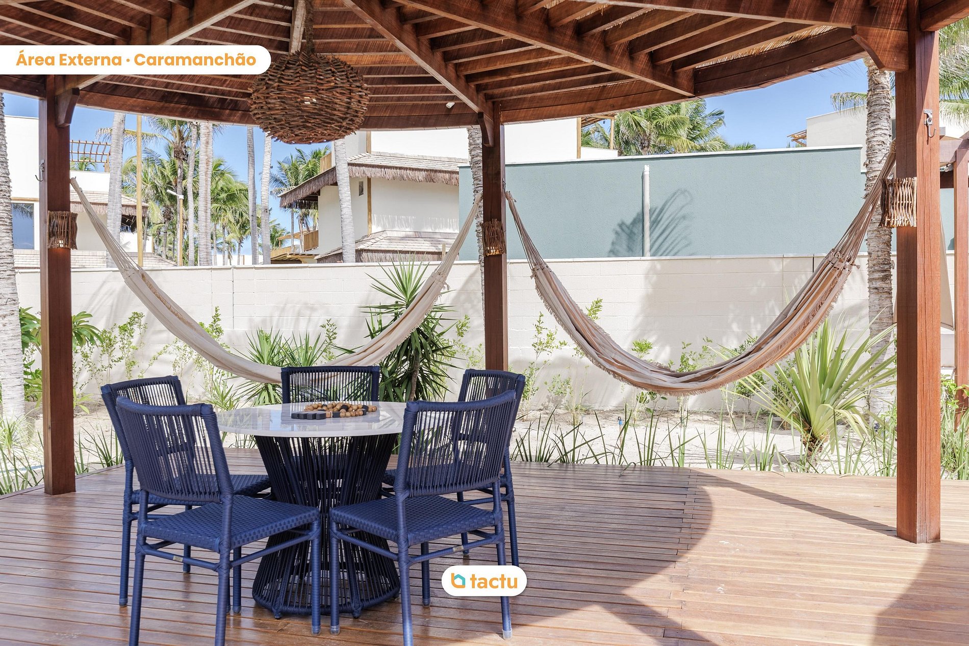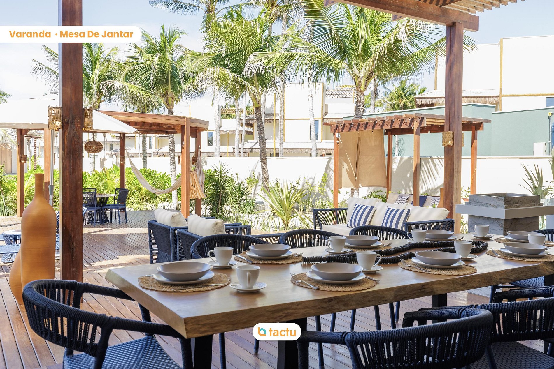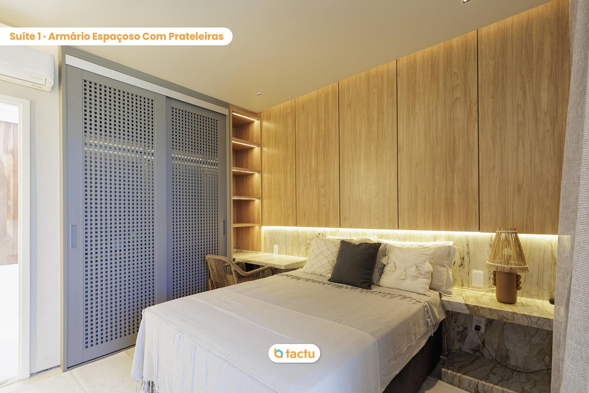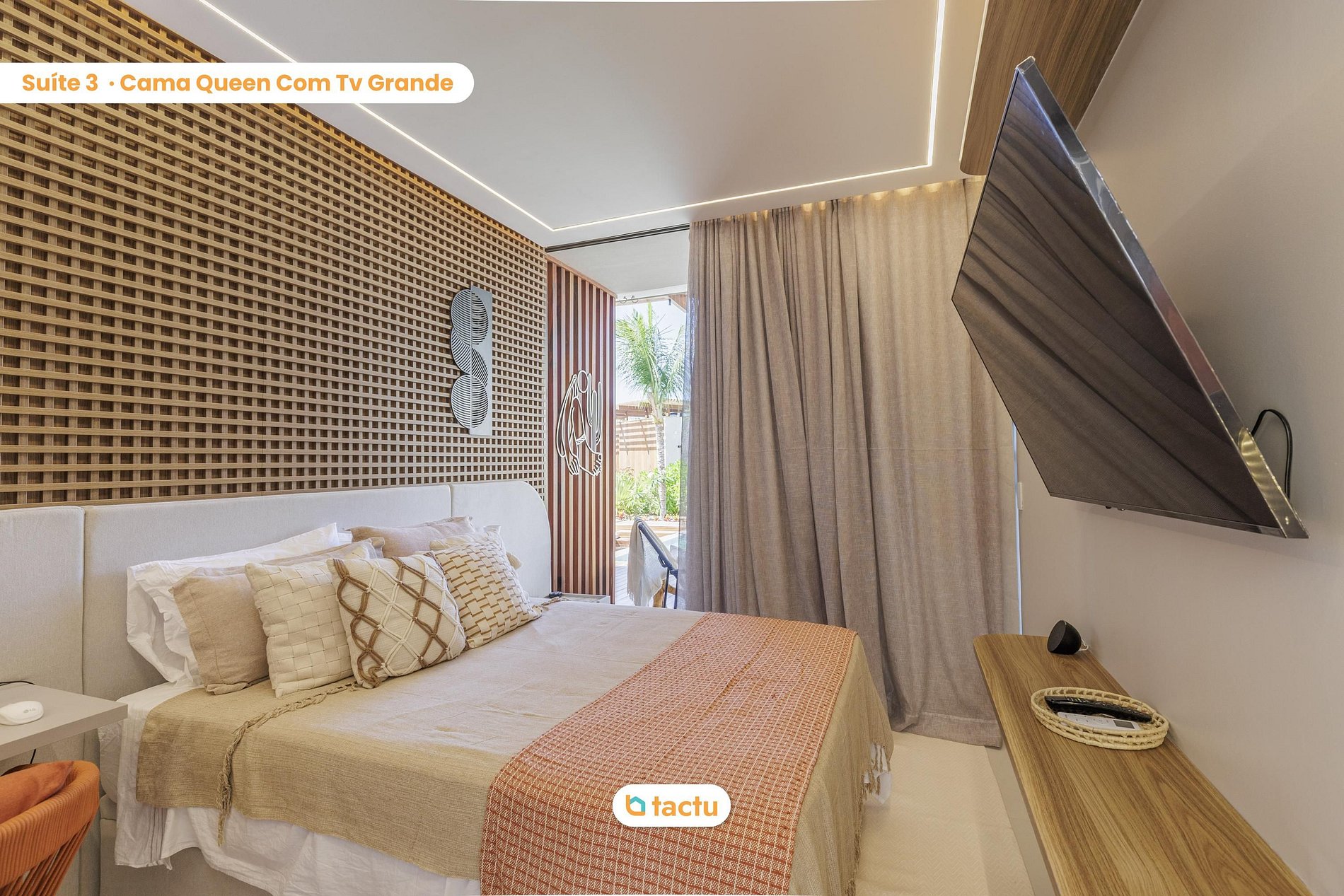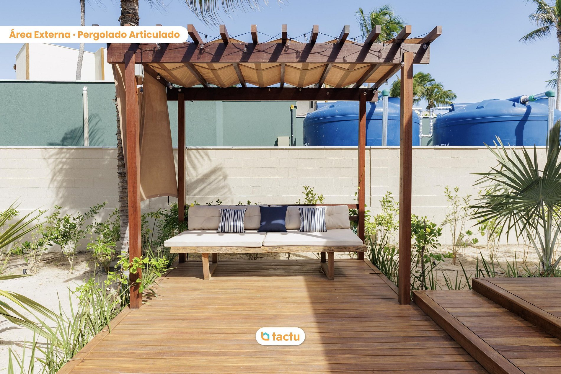 A sala de estar, integrada com a cozinha, conta com paredes de brises de madeira, permitindo a circulação de ar e iluminação natural, criando um ambiente fresco e acolhedor. Com segurança 24h e fácil acesso à praia, você terá tudo o que precisa para vivenciar o melhor de Fortim com o conforto e a exclusividade da Tactu.