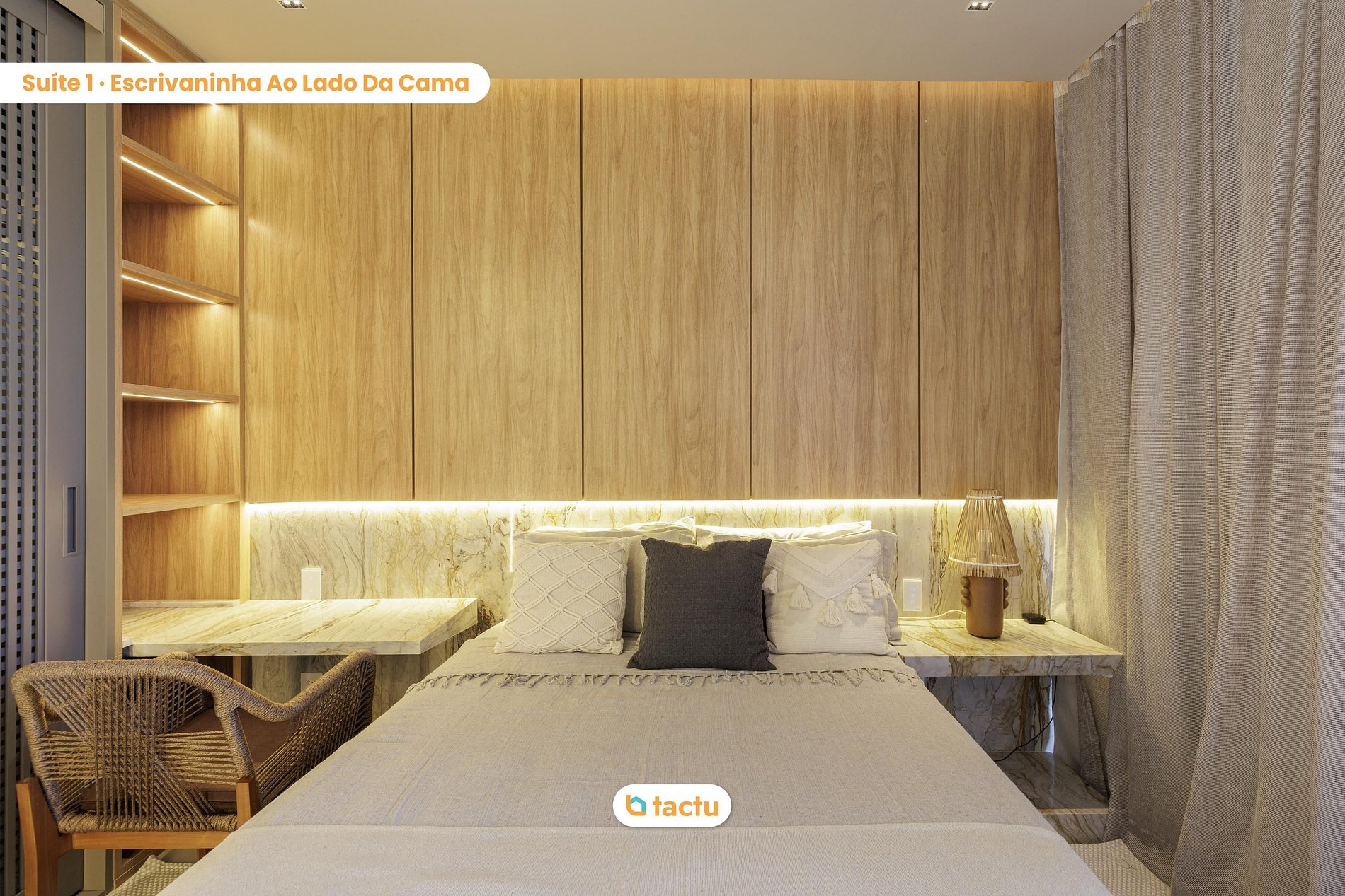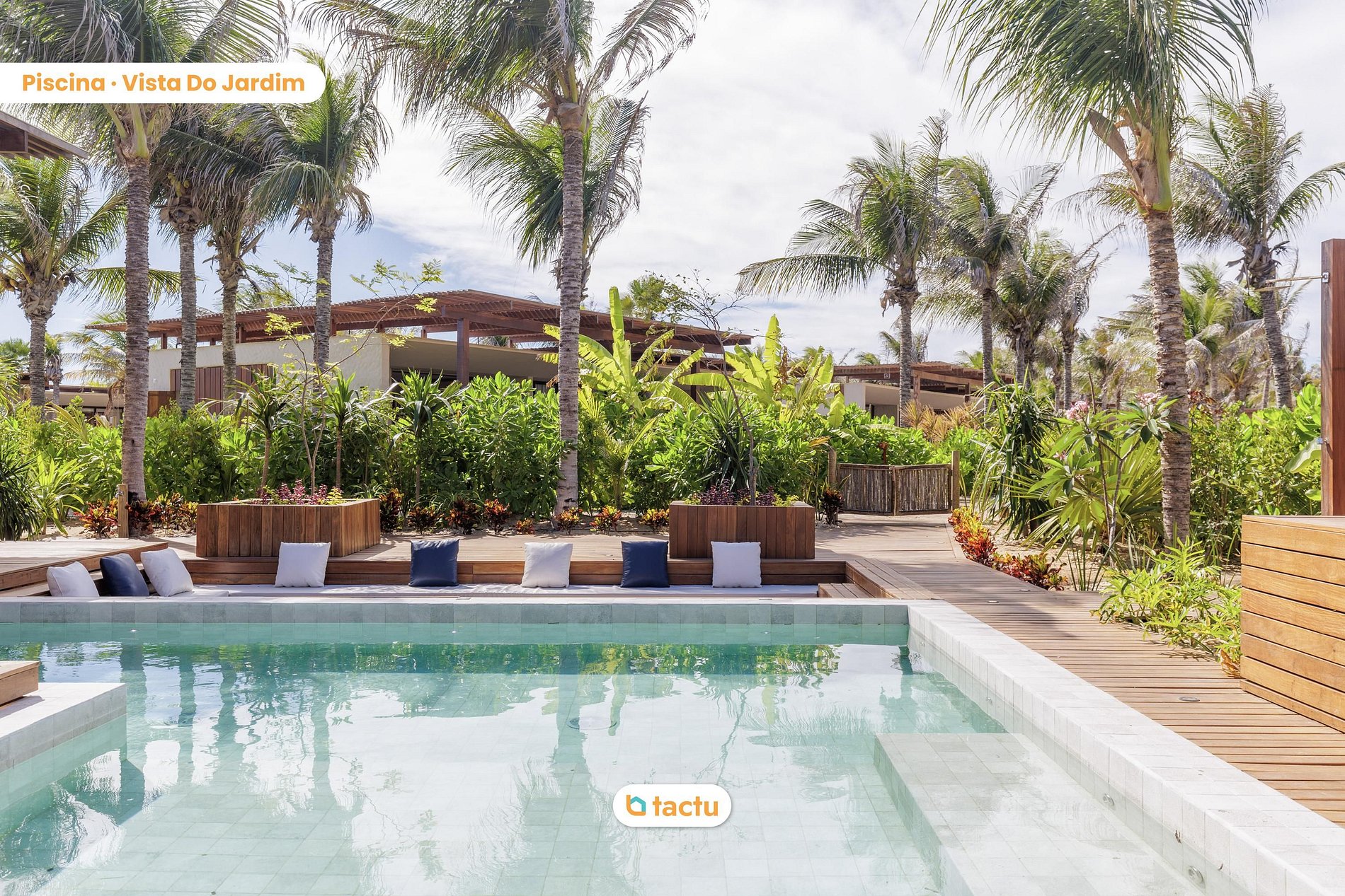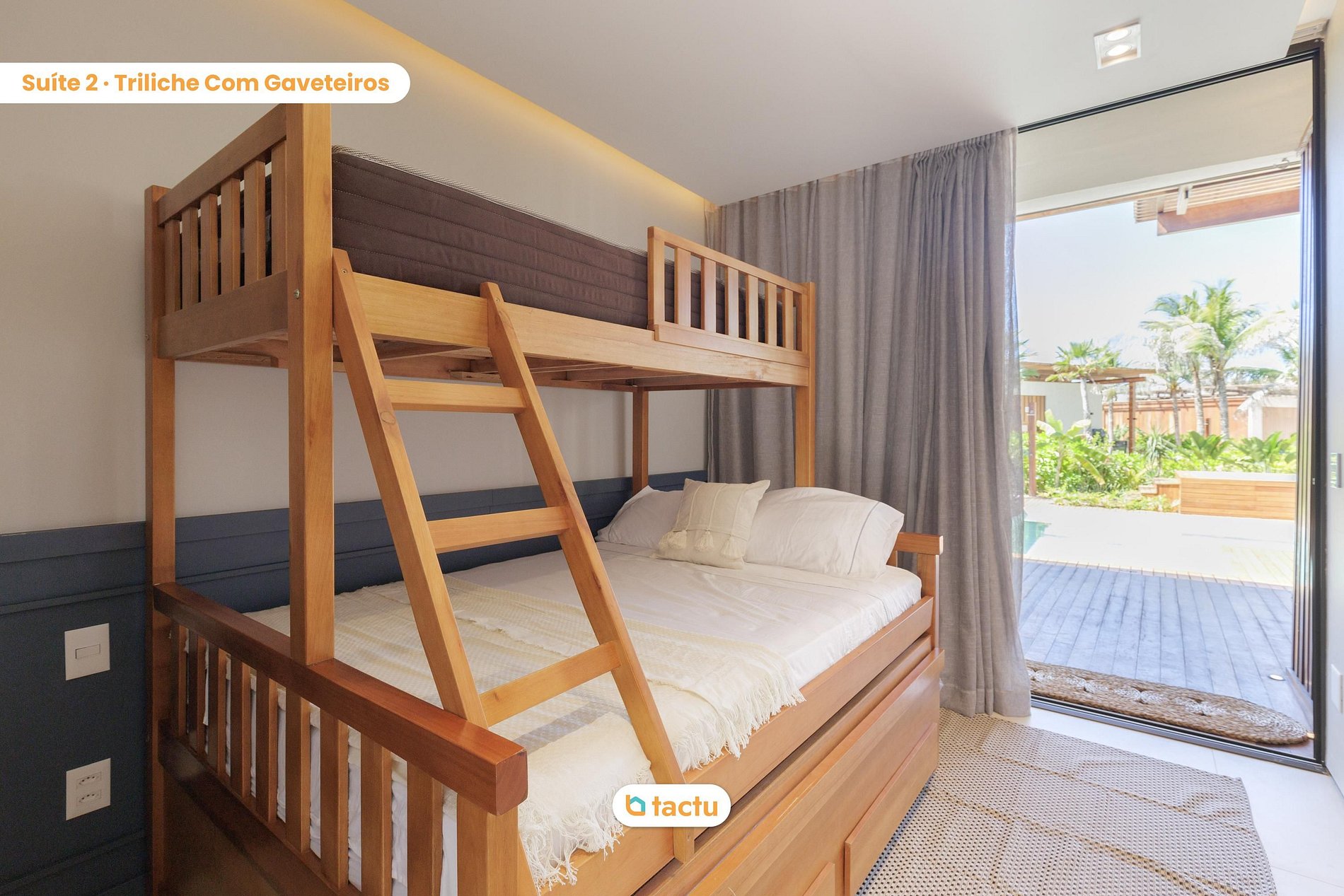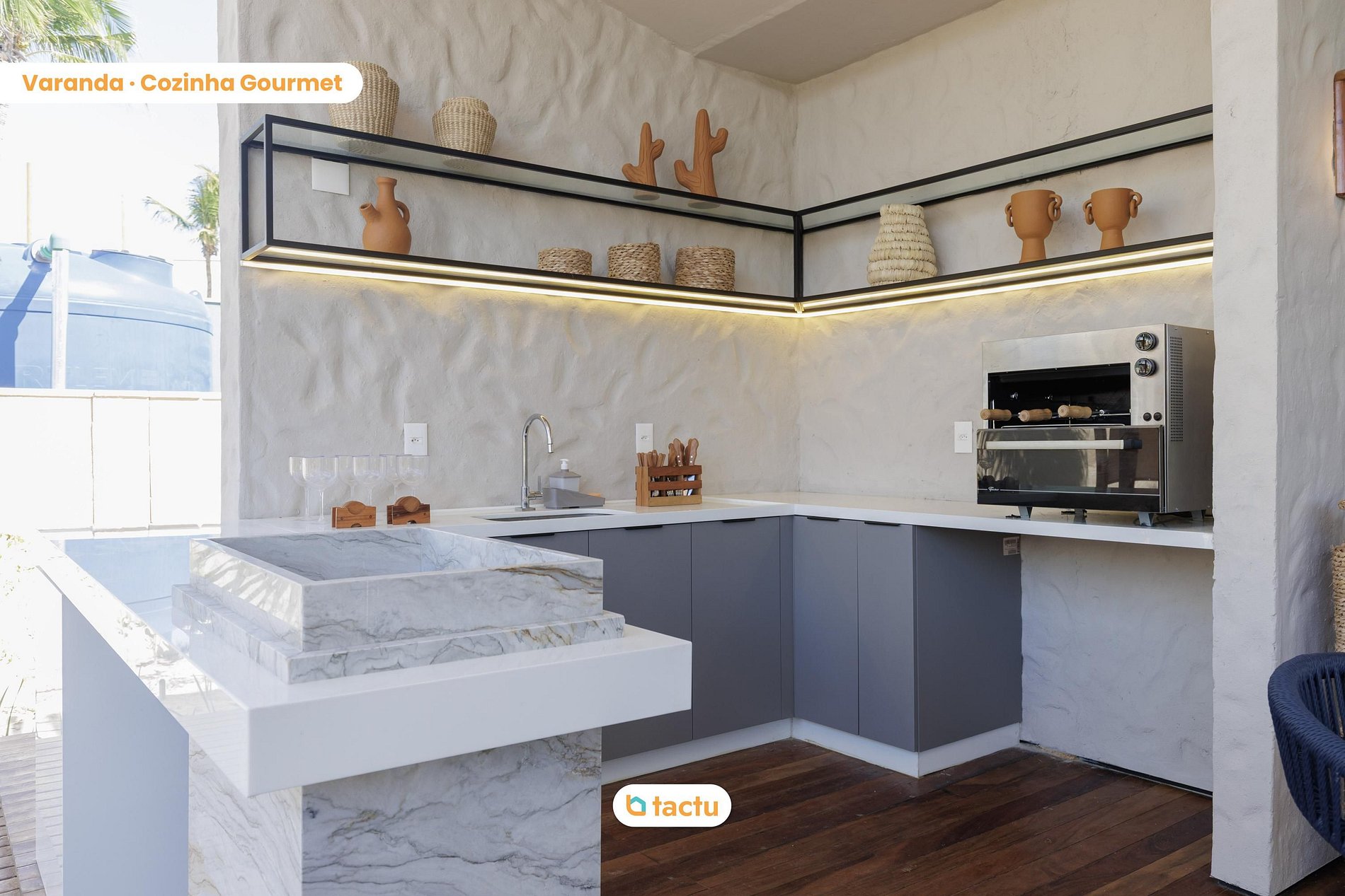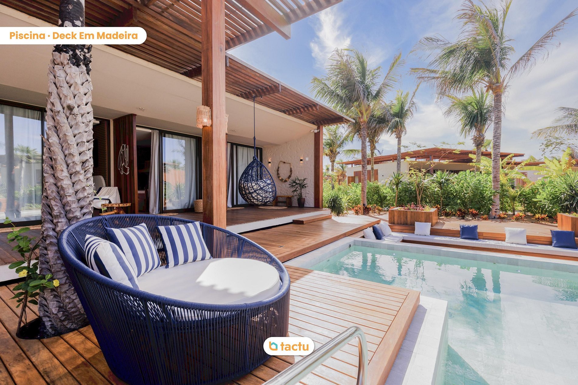A sala de estar, integrada com a cozinha, conta com paredes de brises de madeira, permitindo a circulação de ar e iluminação natural, criando um ambiente fresco e acolhedor. Com segurança 24h e fácil acesso à praia, você terá tudo o que precisa para vivenciar o melhor de Fortim com o conforto e a exclusividade da Tactu.