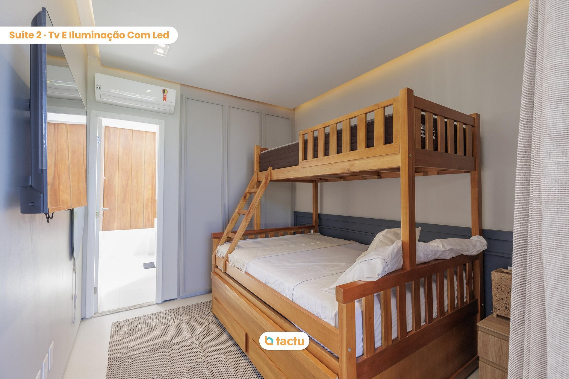 Com capacidade para até 7 pessoas, a casa dispõe de 3 suítes confortáveis: duas com camas queen e uma com beliche (cama de casal na parte inferior e cama de solteiro na parte superior). Todos os quartos contam com ar-condicionado e TV para maior conforto.