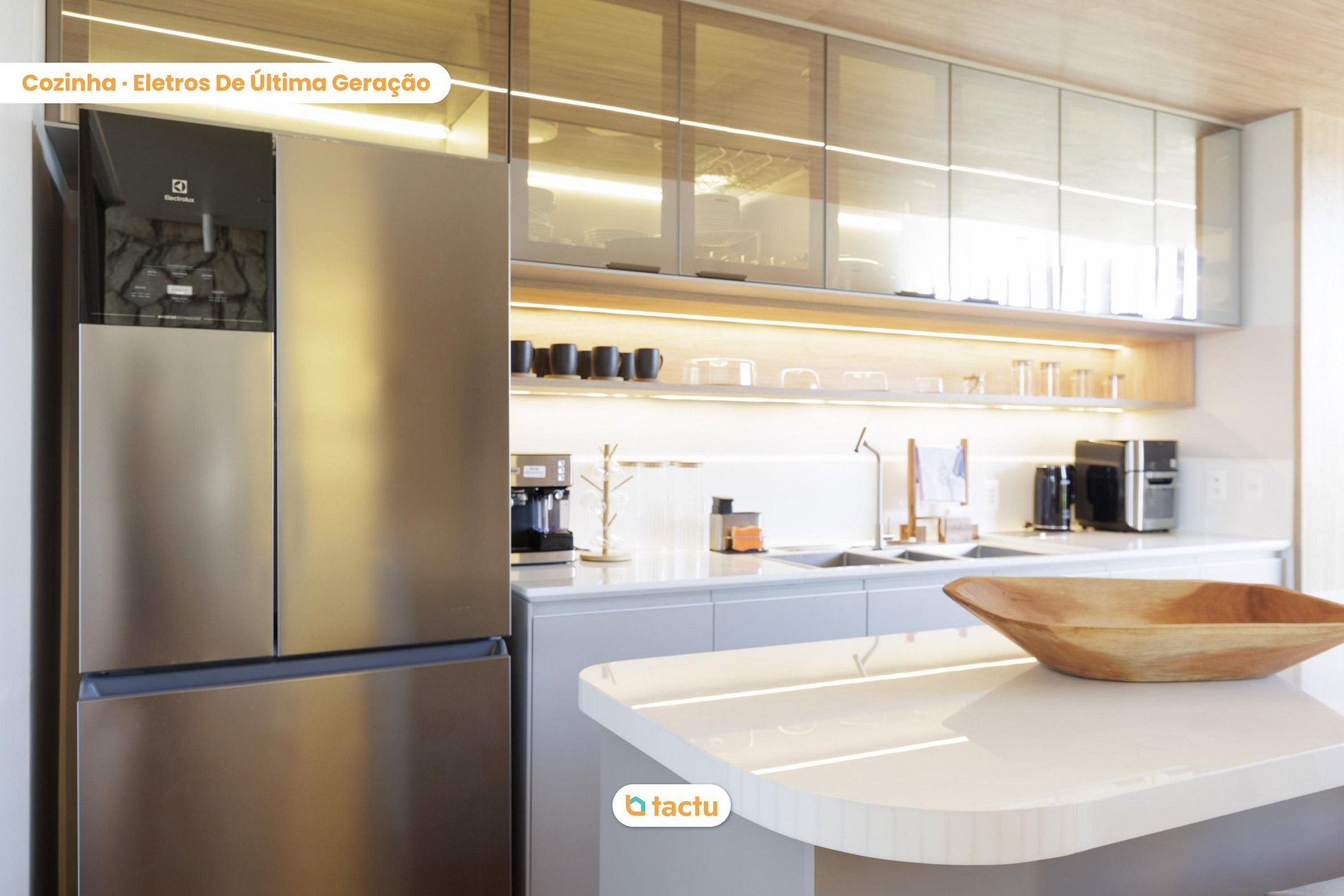 A cozinha, equipada com eletrodomésticos modernos, se conecta à área gourmet, que inclui uma churrasqueira e uma mesa de jantar com 8 lugares, criando o ambiente ideal para reunir a família ou amigos. Os banheiros, espaçosos e com claraboias, oferecem uma experiência única de luz natural, proporcionando a sensação de banho ao ar livre.