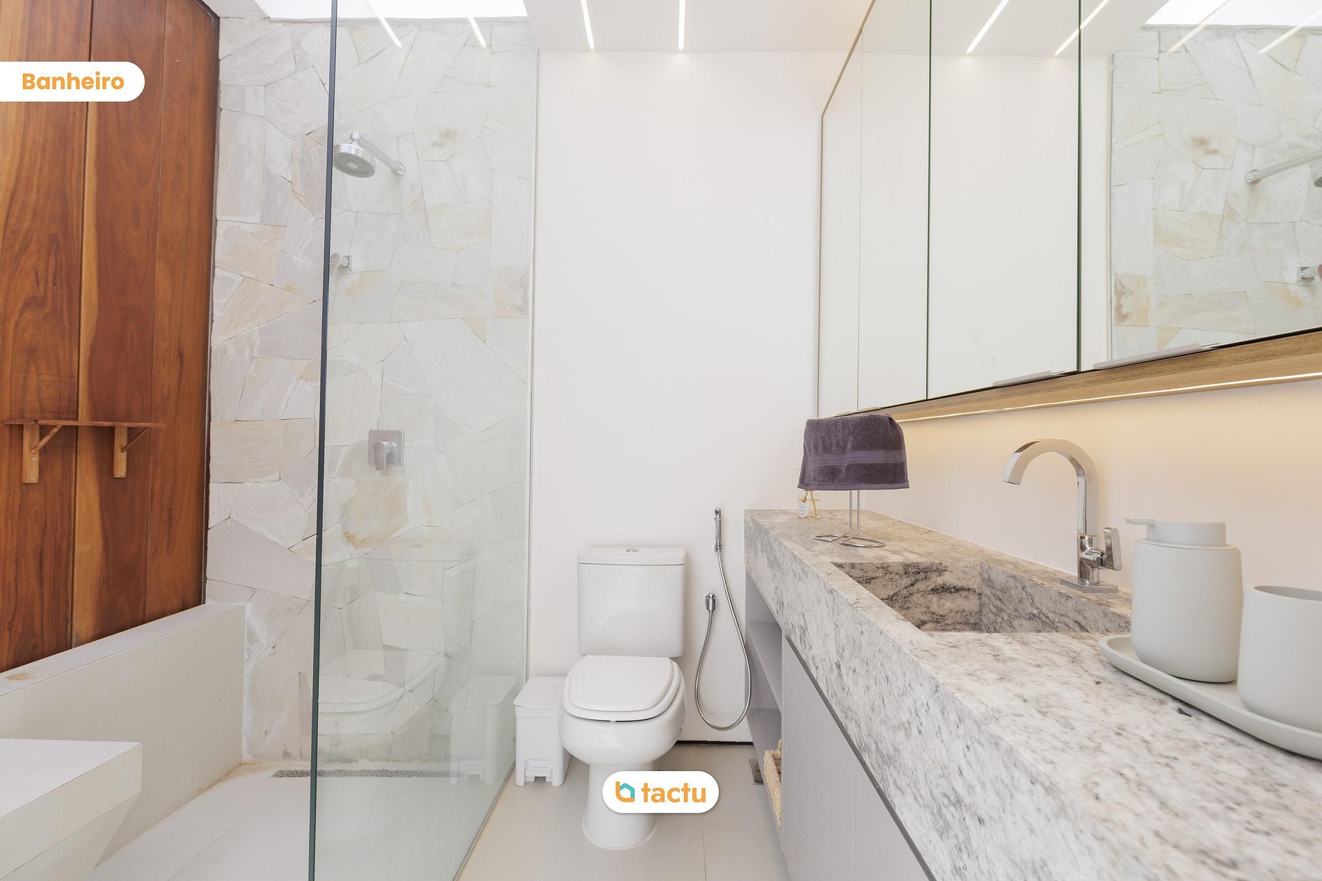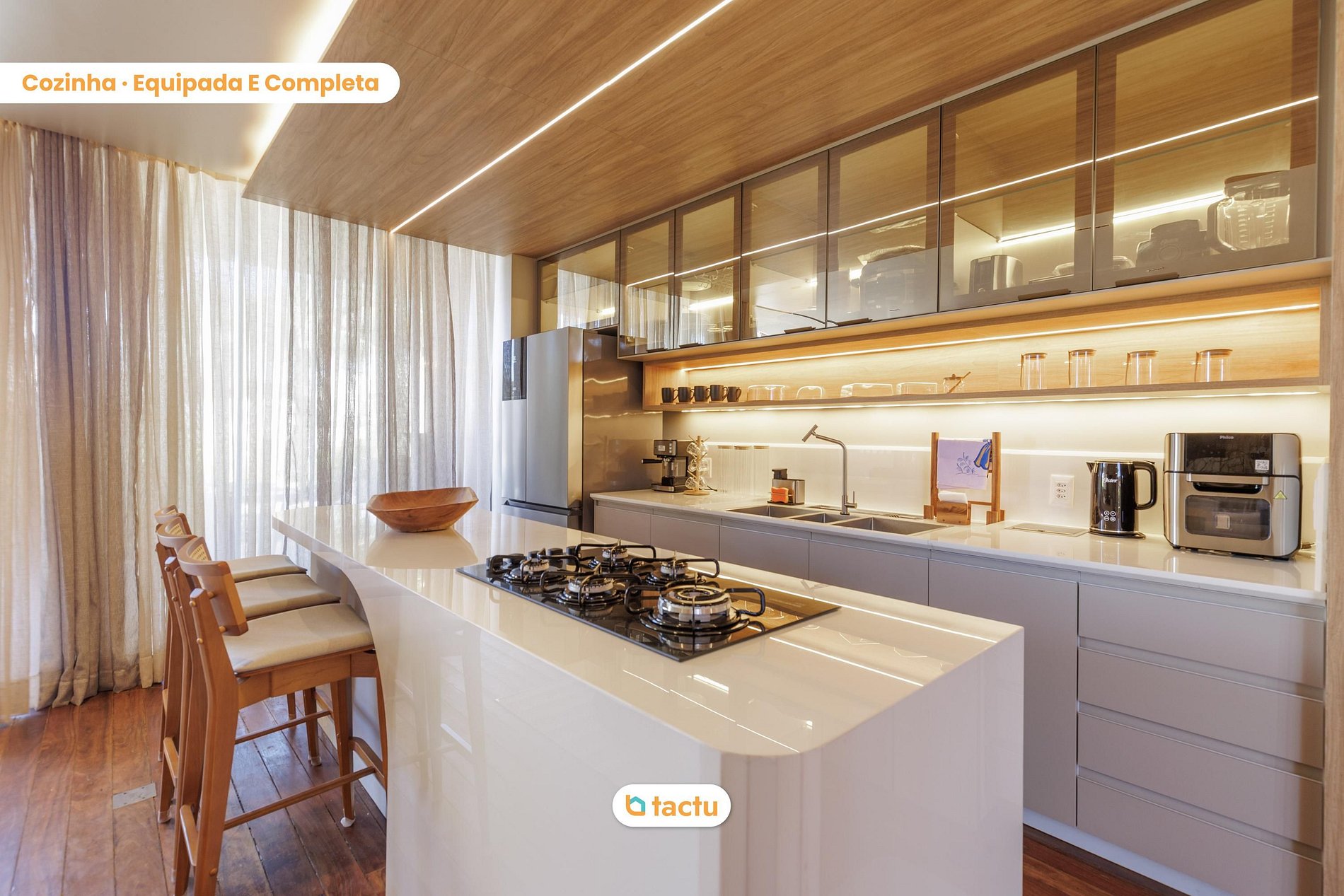 A cozinha, equipada com eletrodomésticos modernos, se conecta à área gourmet, que inclui uma churrasqueira e uma mesa de jantar com 8 lugares, criando o ambiente ideal para reunir a família ou amigos. Os banheiros, espaçosos e com claraboias, oferecem uma experiência única de luz natural, proporcionando a sensação de banho ao ar livre.