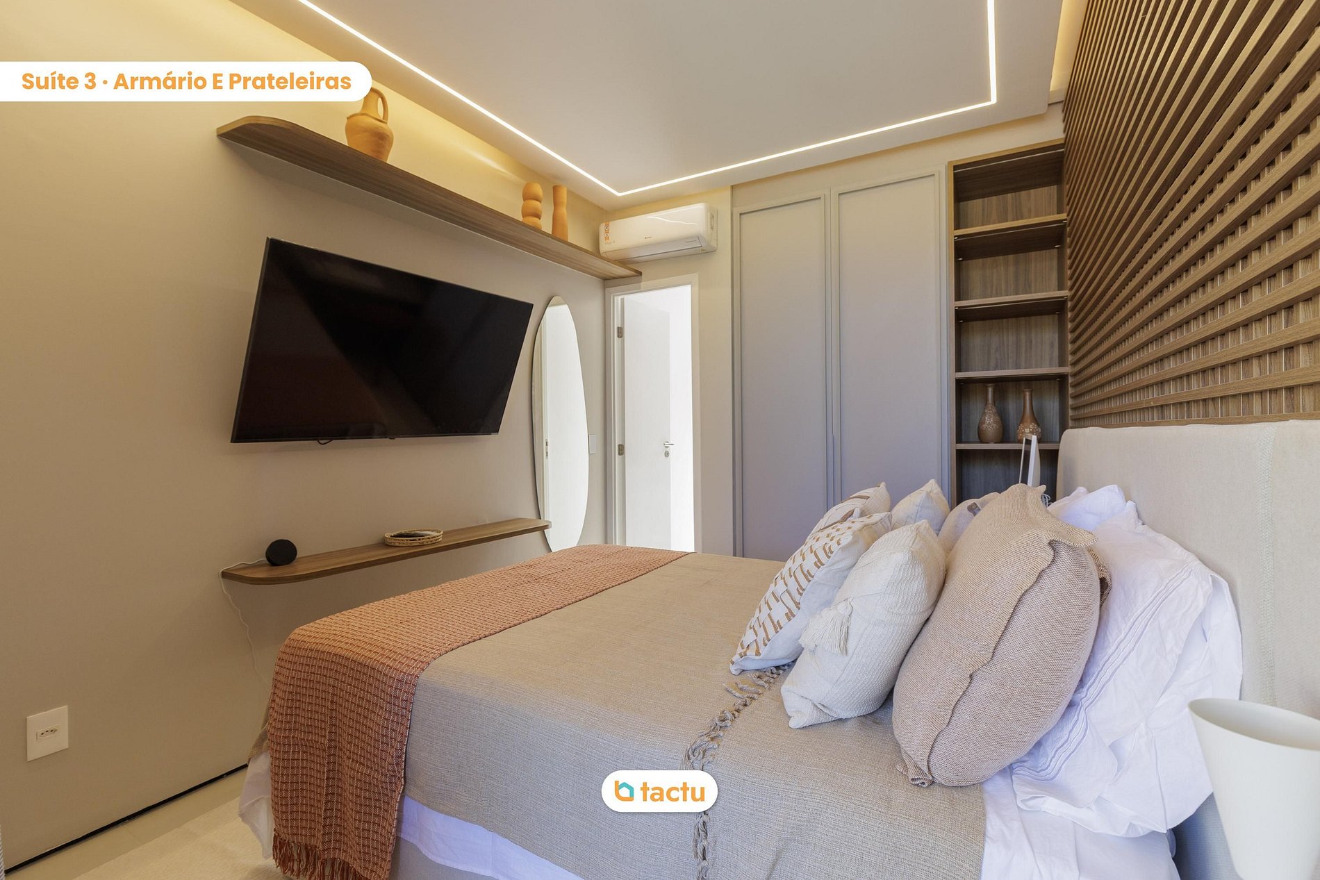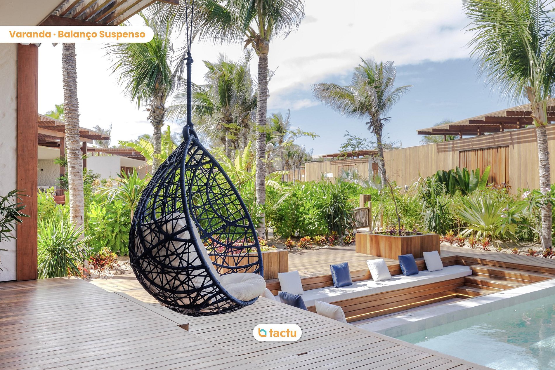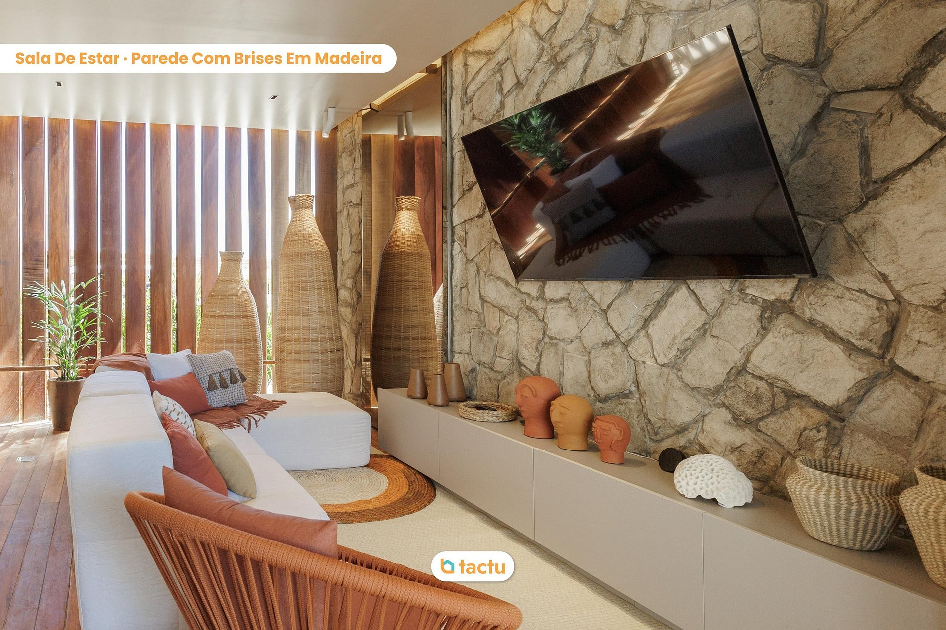 A sala de estar, integrada com a cozinha, conta com paredes de brises de madeira, permitindo a circulação de ar e iluminação natural, criando um ambiente fresco e acolhedor. Com segurança 24h e fácil acesso à praia, você terá tudo o que precisa para vivenciar o melhor de Fortim com o conforto e a exclusividade da Tactu.