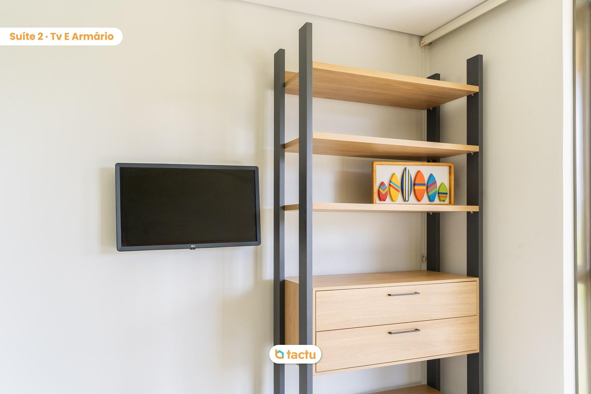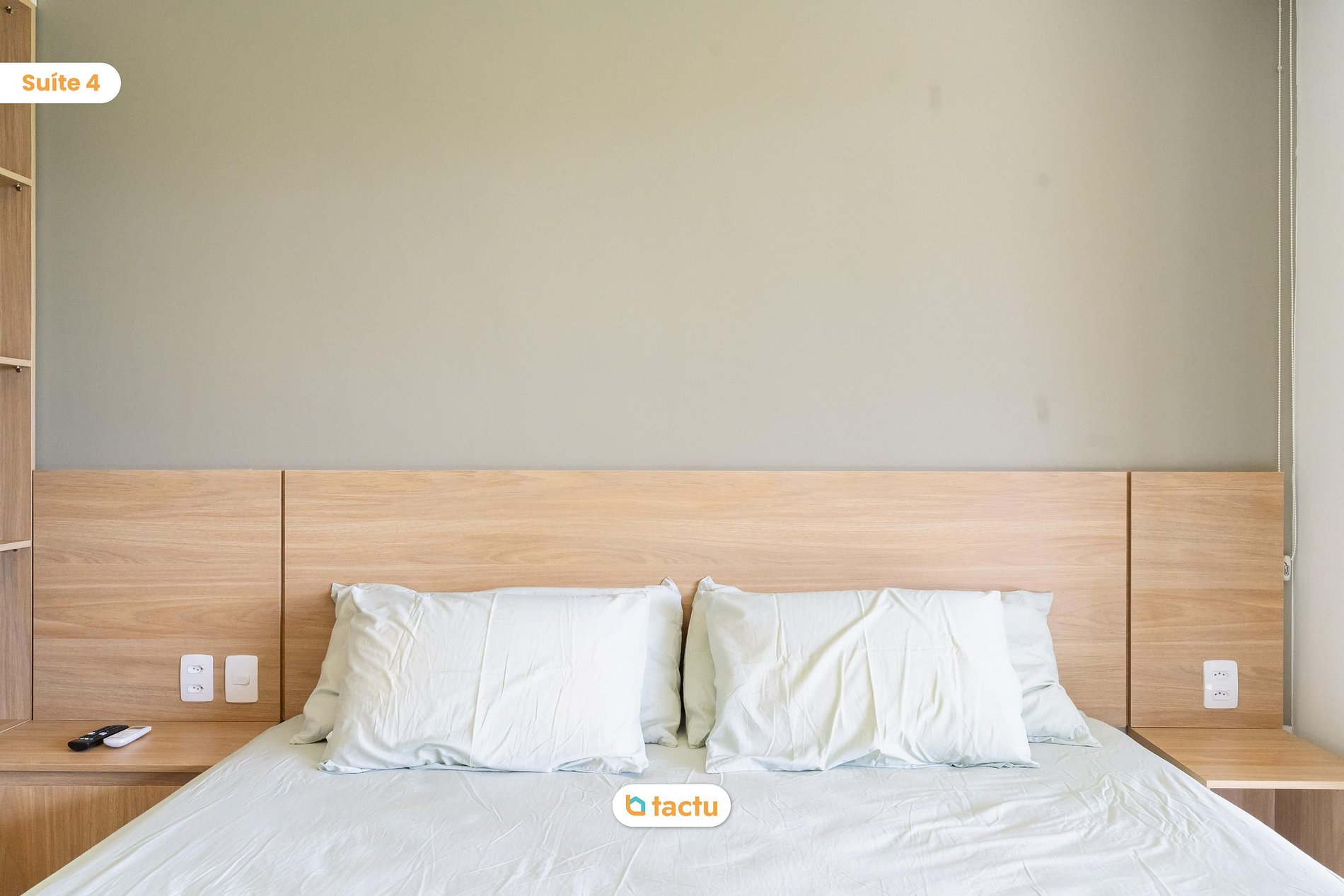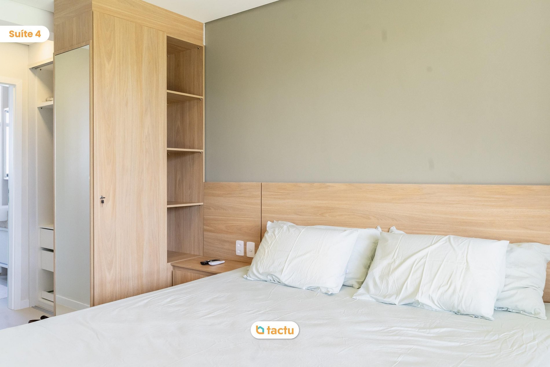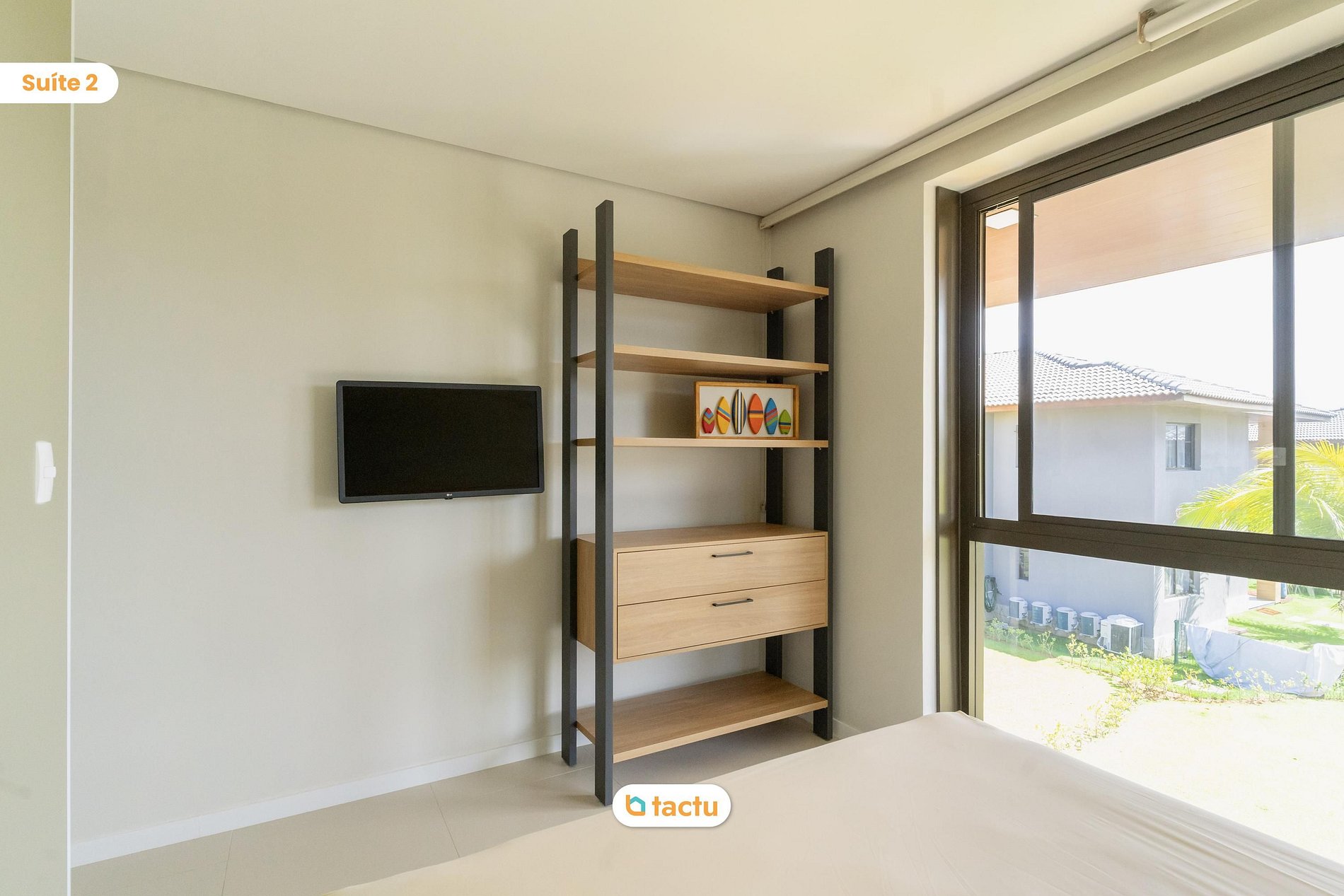 A casa conta com quatro suítes confortáveis: a primeira, no térreo, possui duas camas de solteiro com bicama, TV de 32’’, cabideiro e gavetas; no piso superior, estão duas suítes com cama queen, ar-condicionado, TV de 32’’, cabideiro e gavetas; e a suíte master, também no andar superior, que dispõe de cama king, TV de 32’’, cabideiro, gavetas e guarda-roupa planejado.
