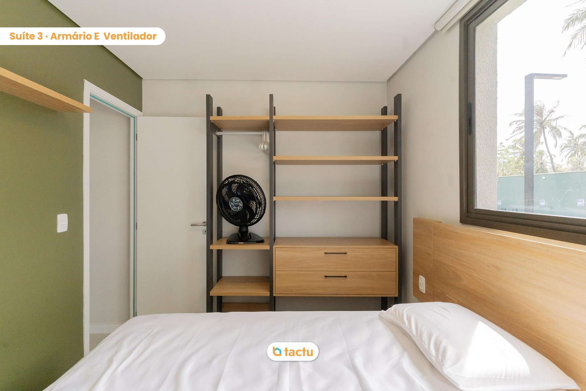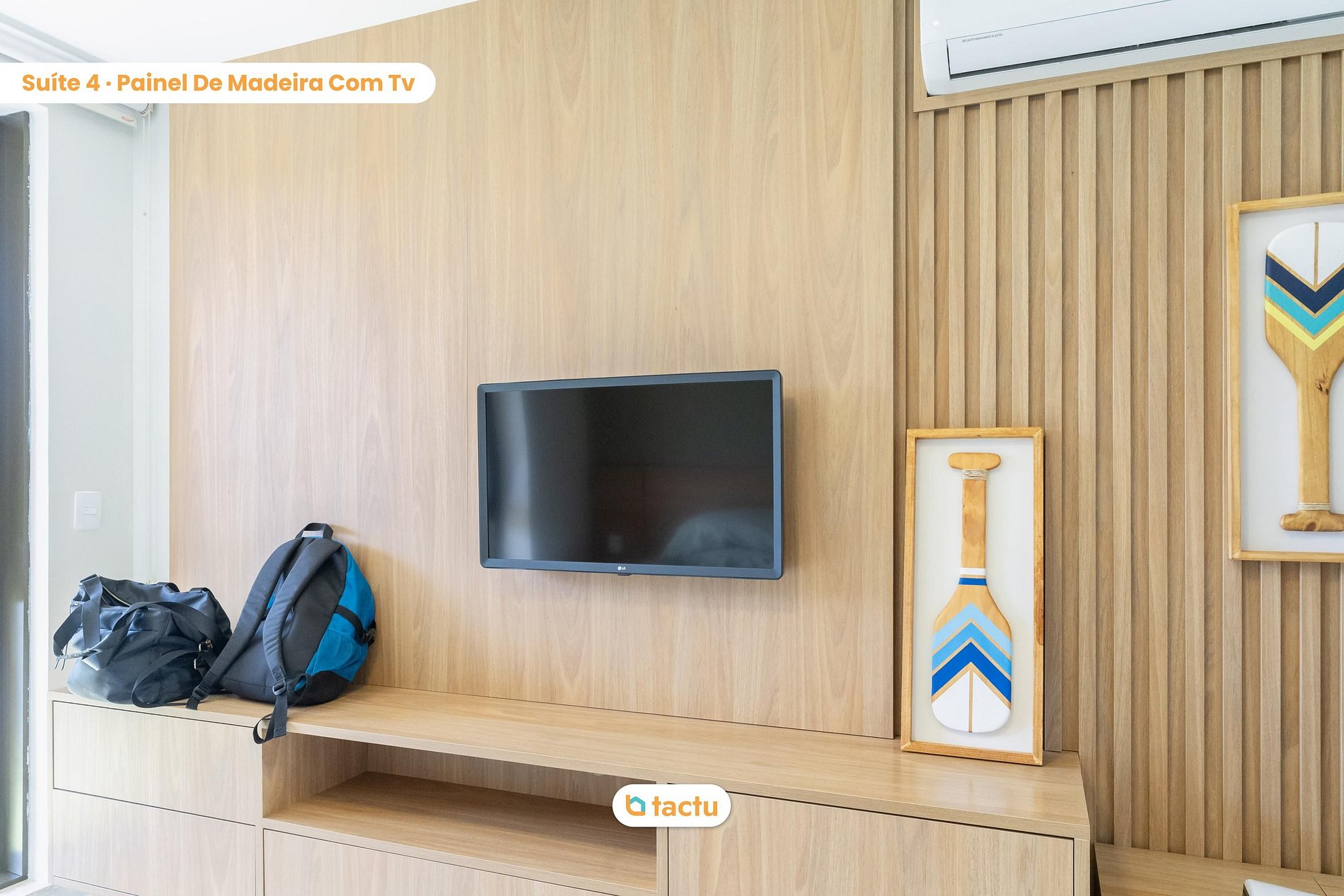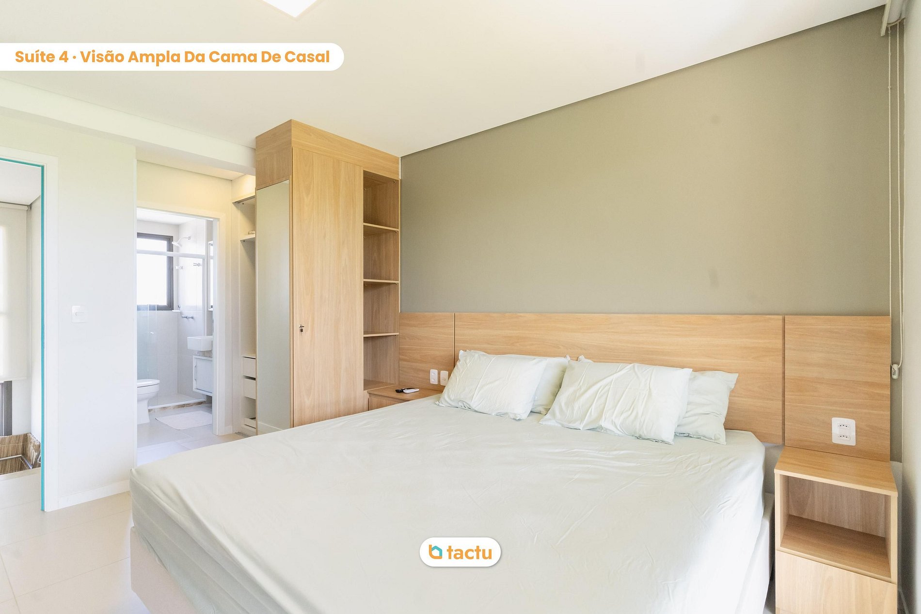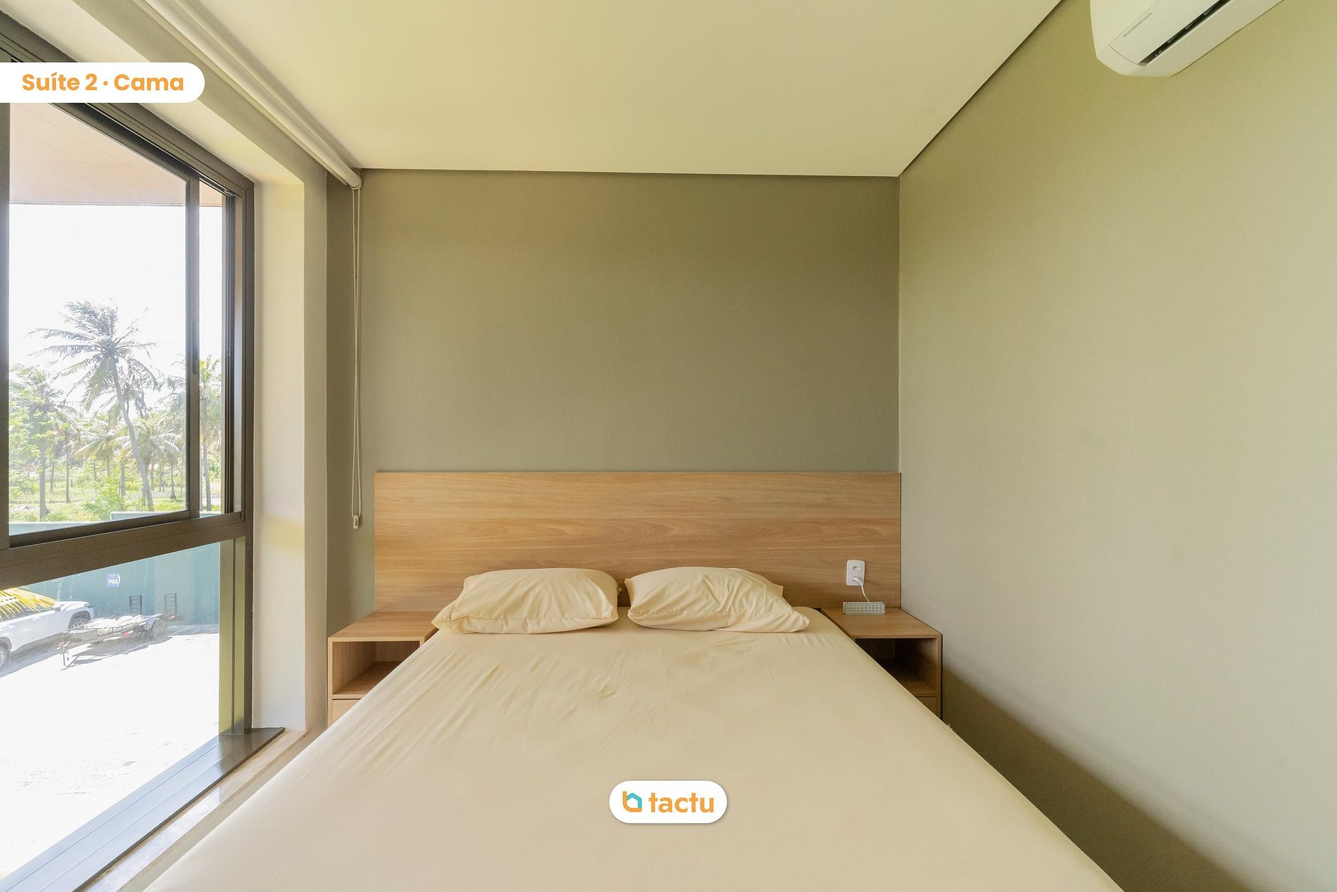A casa conta com quatro suítes confortáveis: a primeira, no térreo, possui duas camas de solteiro com bicama, TV de 32’’, cabideiro e gavetas; no piso superior, estão duas suítes com cama queen, ar-condicionado, TV de 32’’, cabideiro e gavetas; e a suíte master, também no andar superior, que dispõe de cama king, TV de 32’’, cabideiro, gavetas e guarda-roupa planejado.