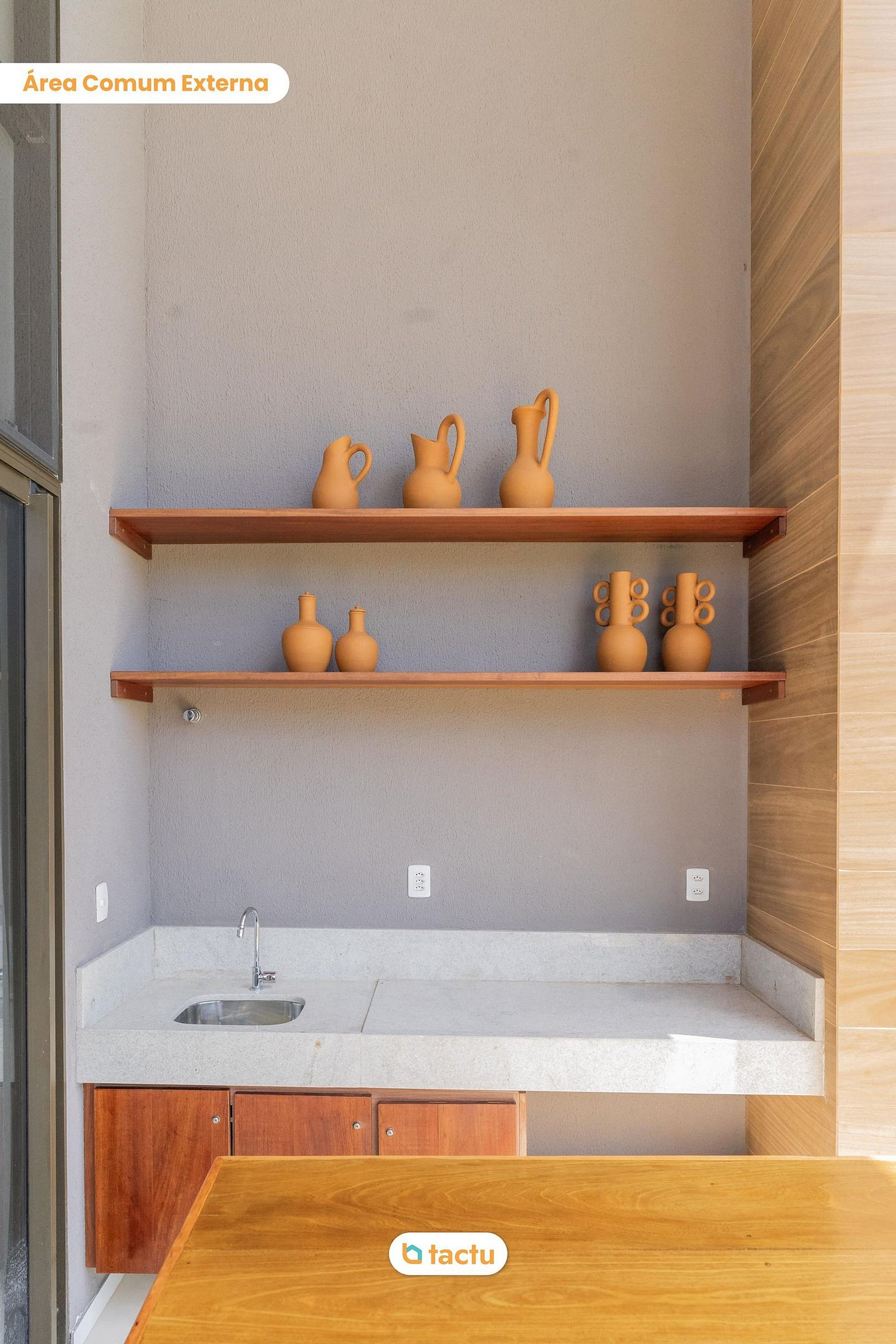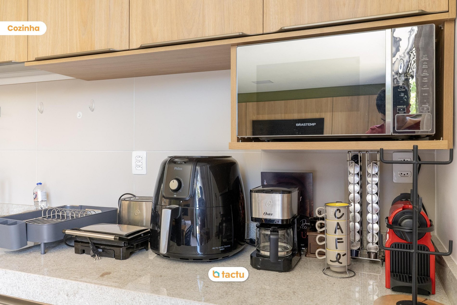 Cozinha equipada com eletrodomésticos e jogos de refeição